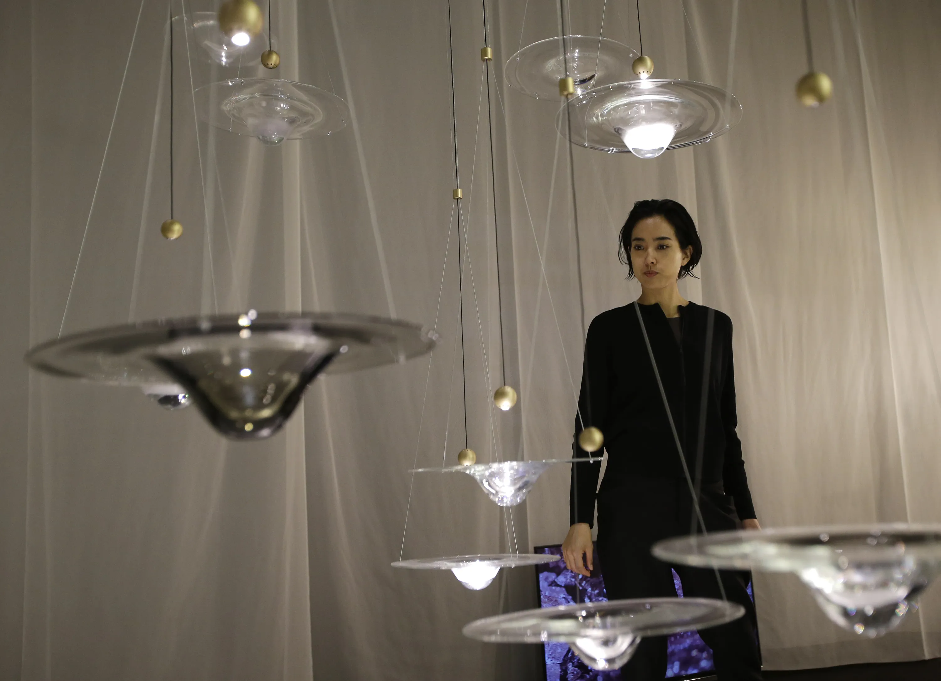 In this picture taken on Tuesday, April 14, 2015, designer Nao Tamura walks past her installations at the Milan Furniture Fair, in Milan, Italy. (Photo by Antonio Calanni/AP Photo)