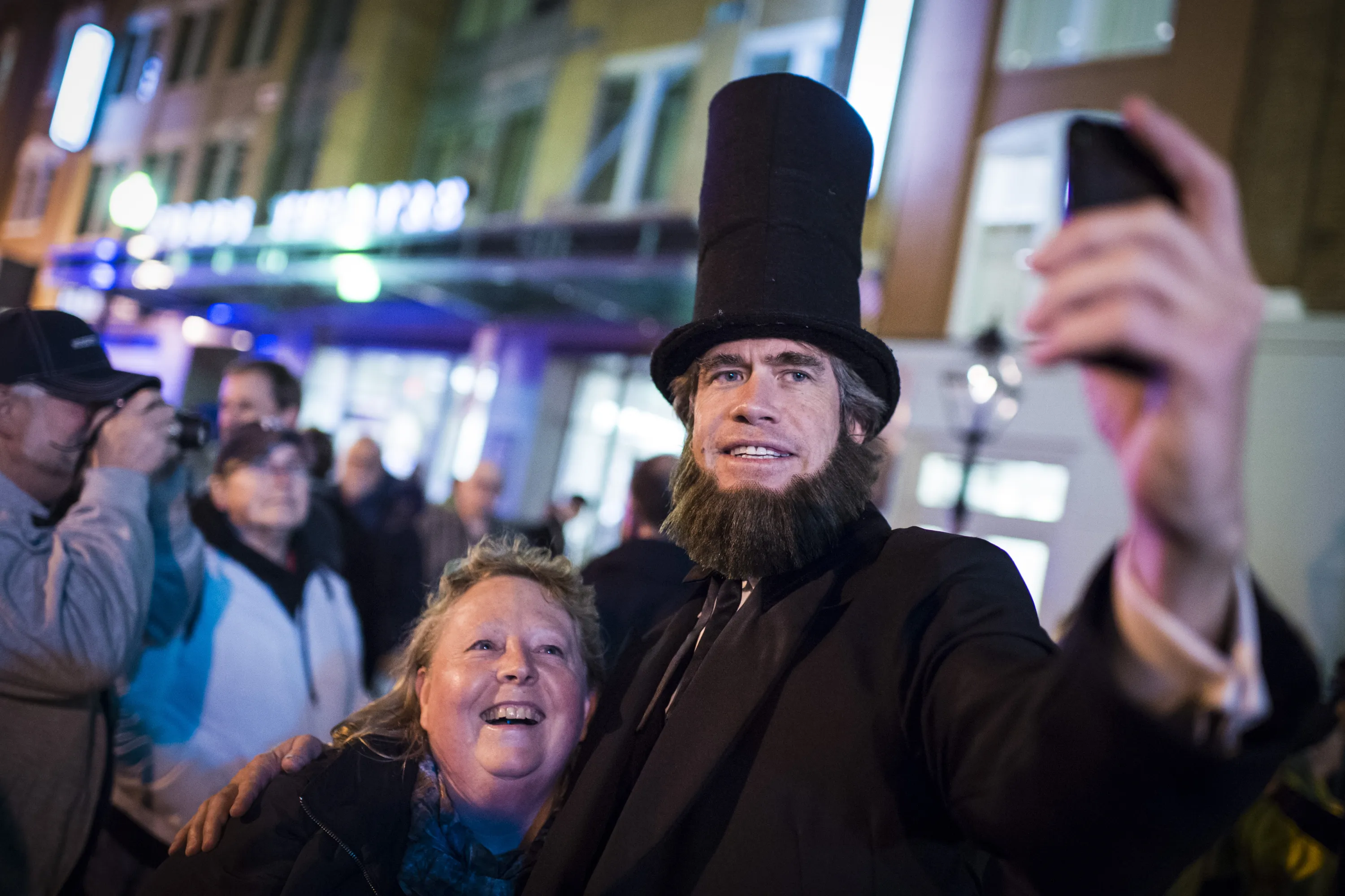 Scott Stewart dressed as Abraham Lincoln takes selfies with Susan Squires before a candlelight vigil where living historians recreated the scene from the night of April 14, 1865 on Tenth Street NW to commemorate the 150th anniversary of President Lincoln's assassination outside Ford's Theatre in Washington, DC on Tuesday April 14, 2015. (Photo by Jabin Botsford/The Washington Post)