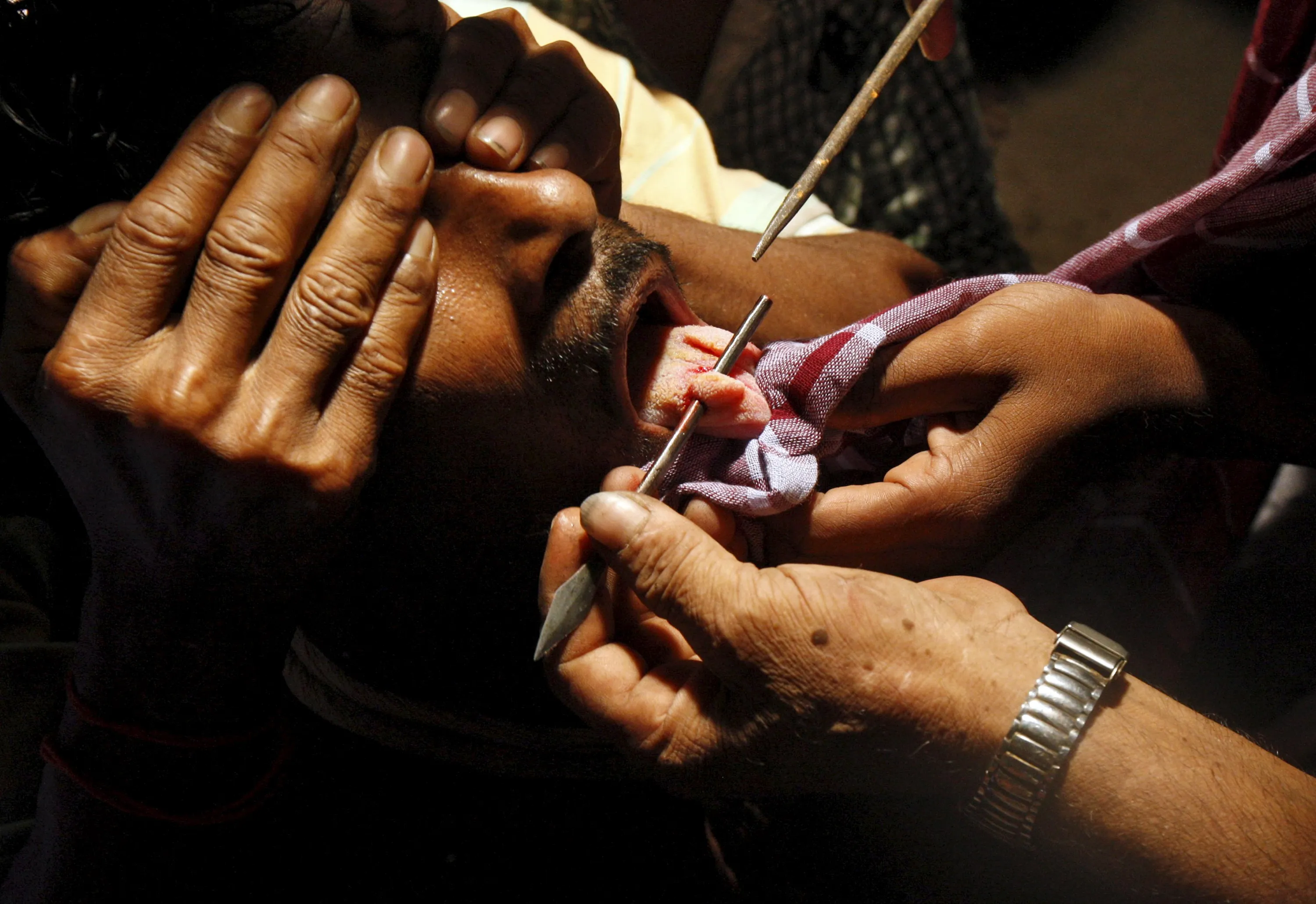 The tongue of a Hindu devotee is pieced with a metal skewer during the annual Shiva Gajan religious festival in Batanal village, east of Kolkata, April 14, 2015. (Photo by Rupak De Chowdhuri/Reuters)
