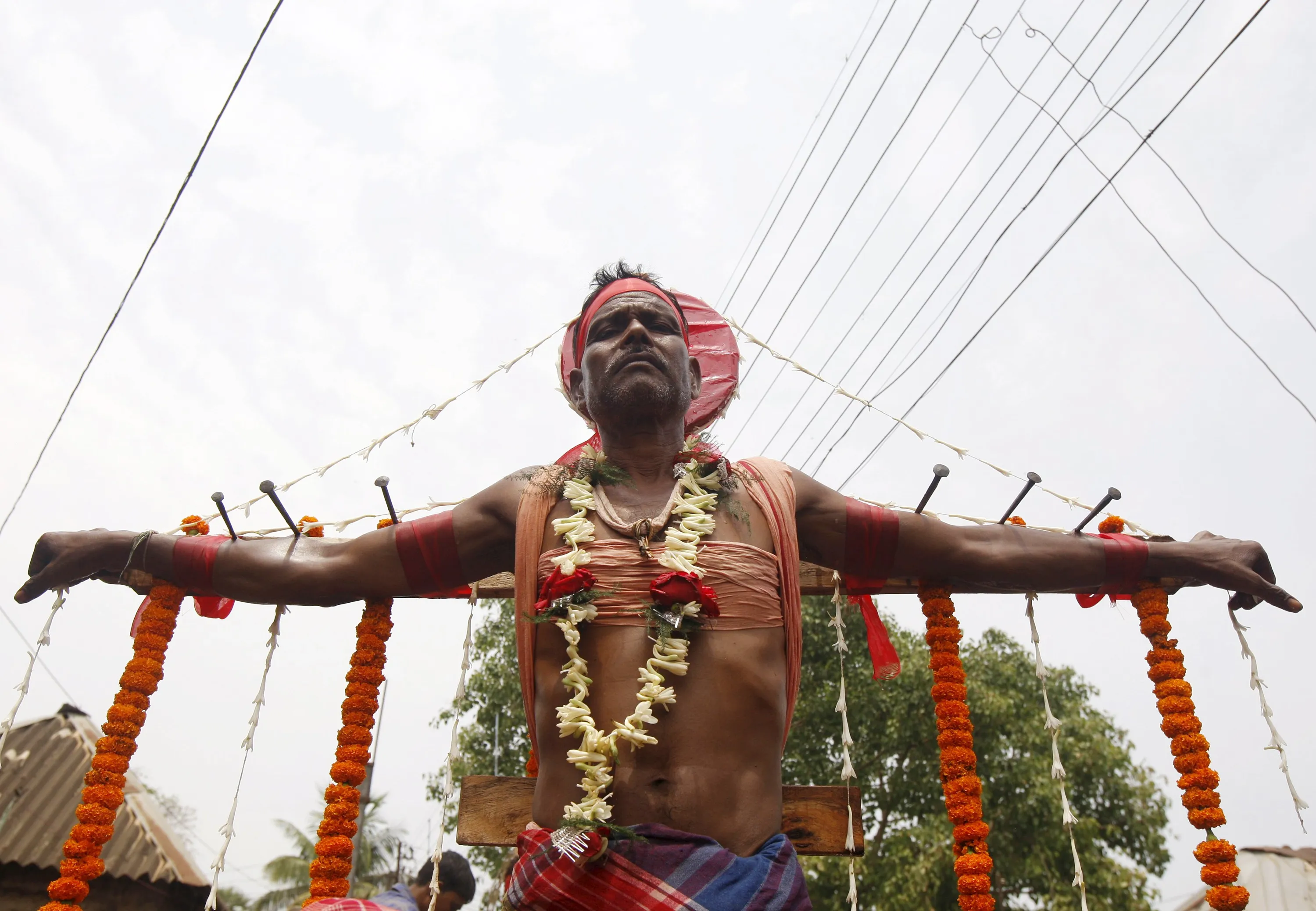 A Hindu devotee is seen nailed to a cross during the annual Shiva Gajan religious festival in Batanal village, east of Kolkata, April 14, 2015. (Photo by Rupak De Chowdhuri/Reuters)