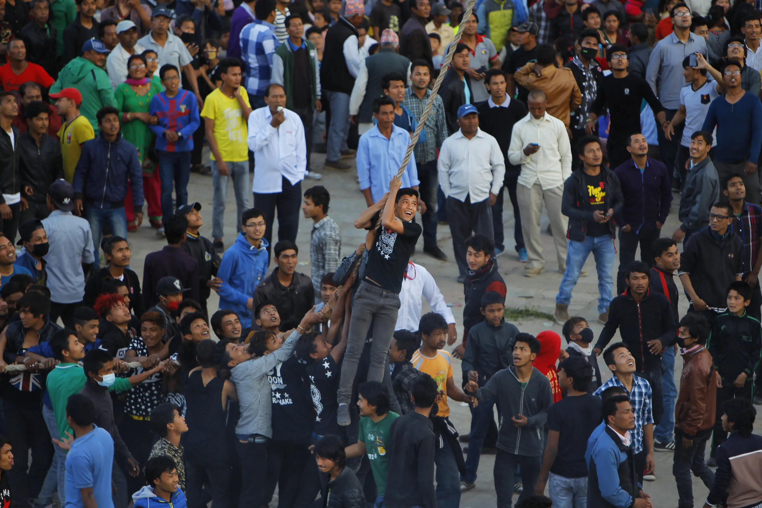 A Nepalese devotee hangs on a rope tied to a “lingo” a long wooden pole symbolizing a phallus, erected a day earlier with the belief that it will bring happiness and good harvest, during the Bisket festival at Bhaktapur, Tuesday, April 14, 2015. (Photo by Niranjan Shrestha/AP Photo)
