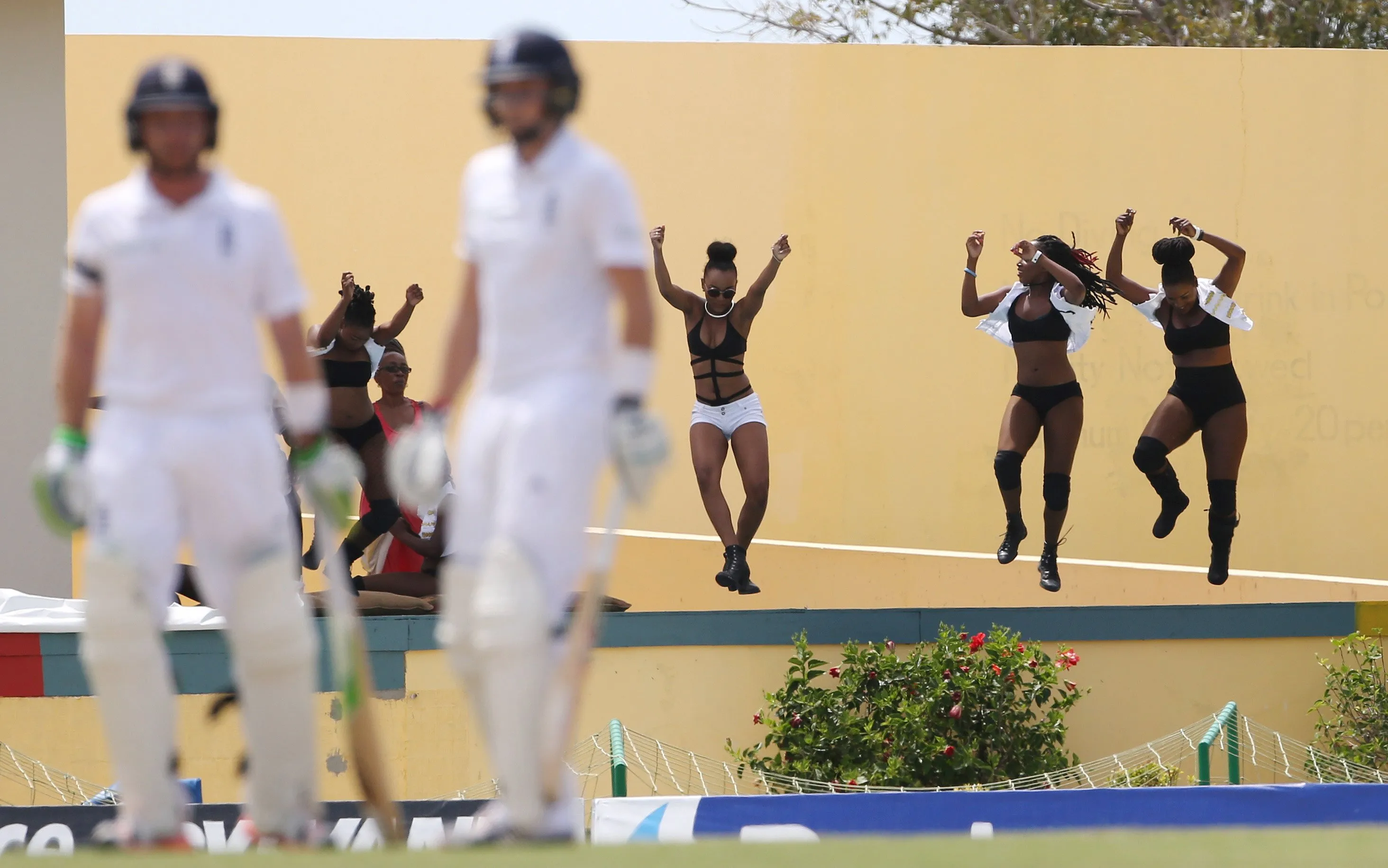 Cricket, West Indies v England, First Test; Sir Vivian Richards Stadium, Antigua, April 13, 2015: England's Joe Root and Ian Bell look on as girls dance in the background. (Photo by Jason O'Brien/Reuters)