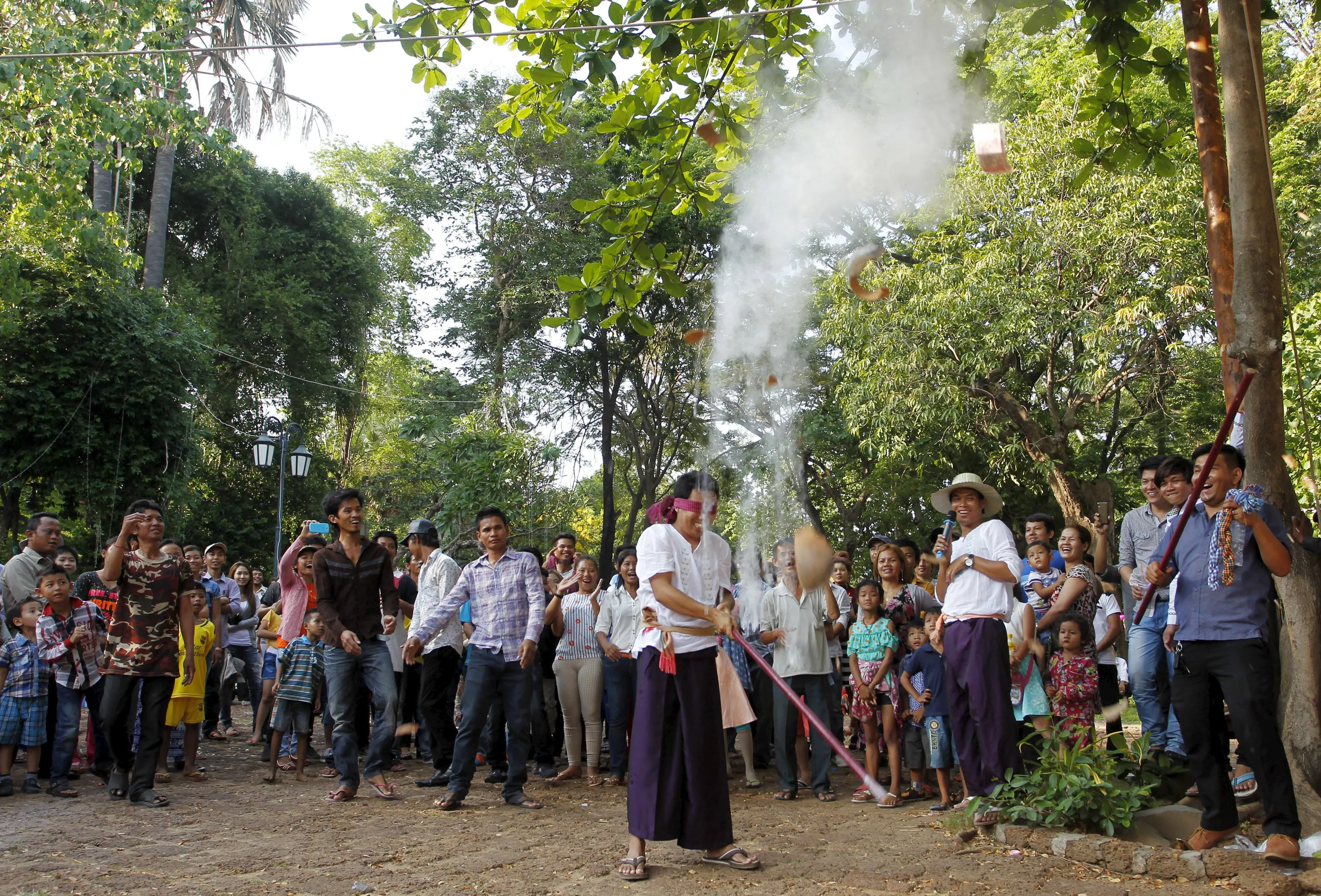 A man hits a claypot as he takes part in a traditional game during Cambodia's New Year in central Phnom Penh April 14, 2015. (Photo by Samrang Pring/Reuters)