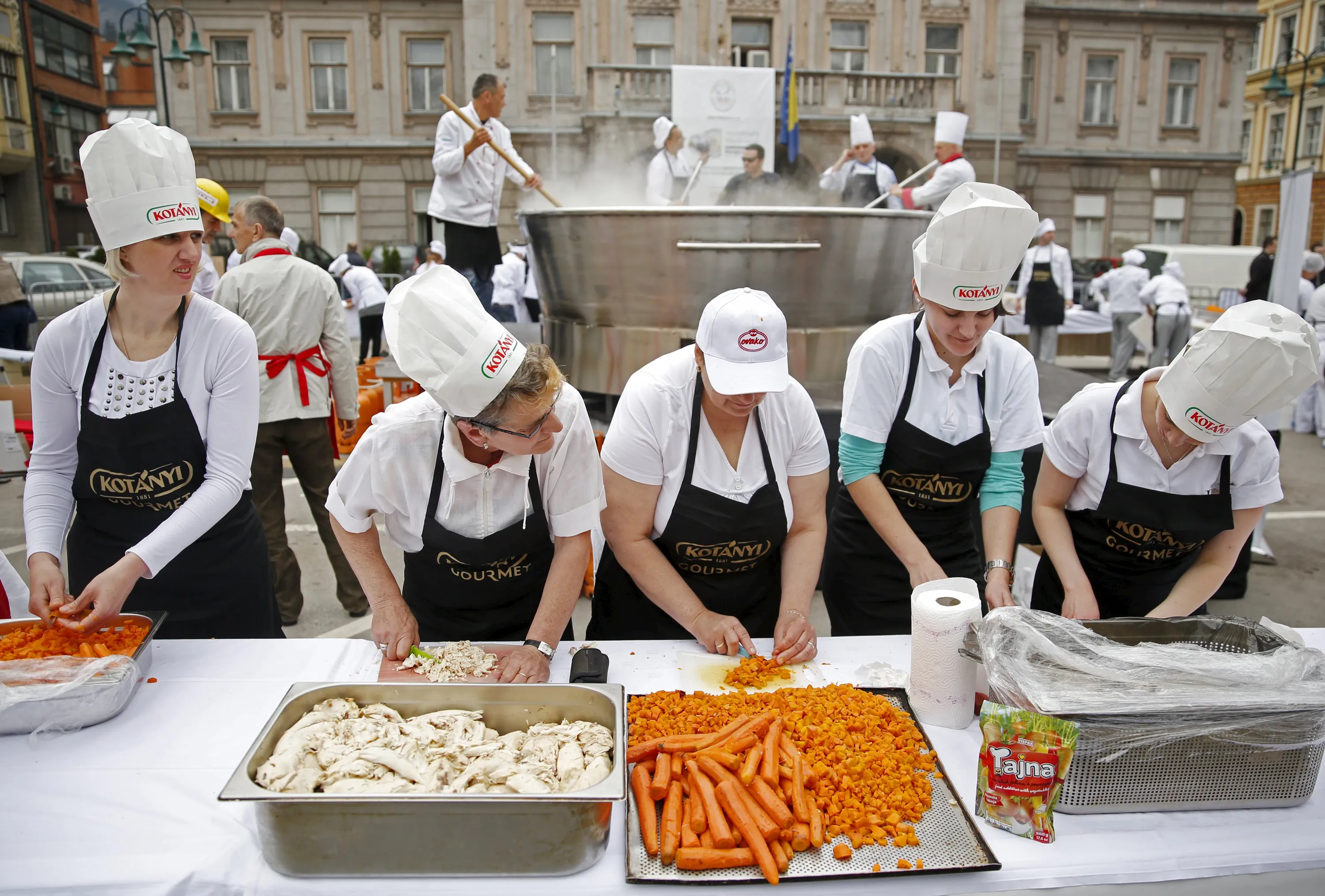 Bosnian chefs cook in a Guinness Book of World Records attempt for the largest chicken broth, in a central square of the Bosnian capital of Sarajevo, April 17, 2015. “Bey's Broth”, the Bosnian meat and vegetable speciality weighing 4,124 kilograms, was cooked in a 2.5 metre diameter pot specially made by a local company. Ingredients included one tonne of poultry, 350 kilograms of various vegetables, 120 litres of oil, 100 kilograms of flour, 50 kilograms of butter and also milk, eggs and milk cream. The attempt also aims to highlight Bosnian cuisine and the Global Chefs Challenge semi-finals, a competition for southeastern European chefs, taking place in Sarajevo on Friday. (Photo by Dado Ruvic/Reuters)