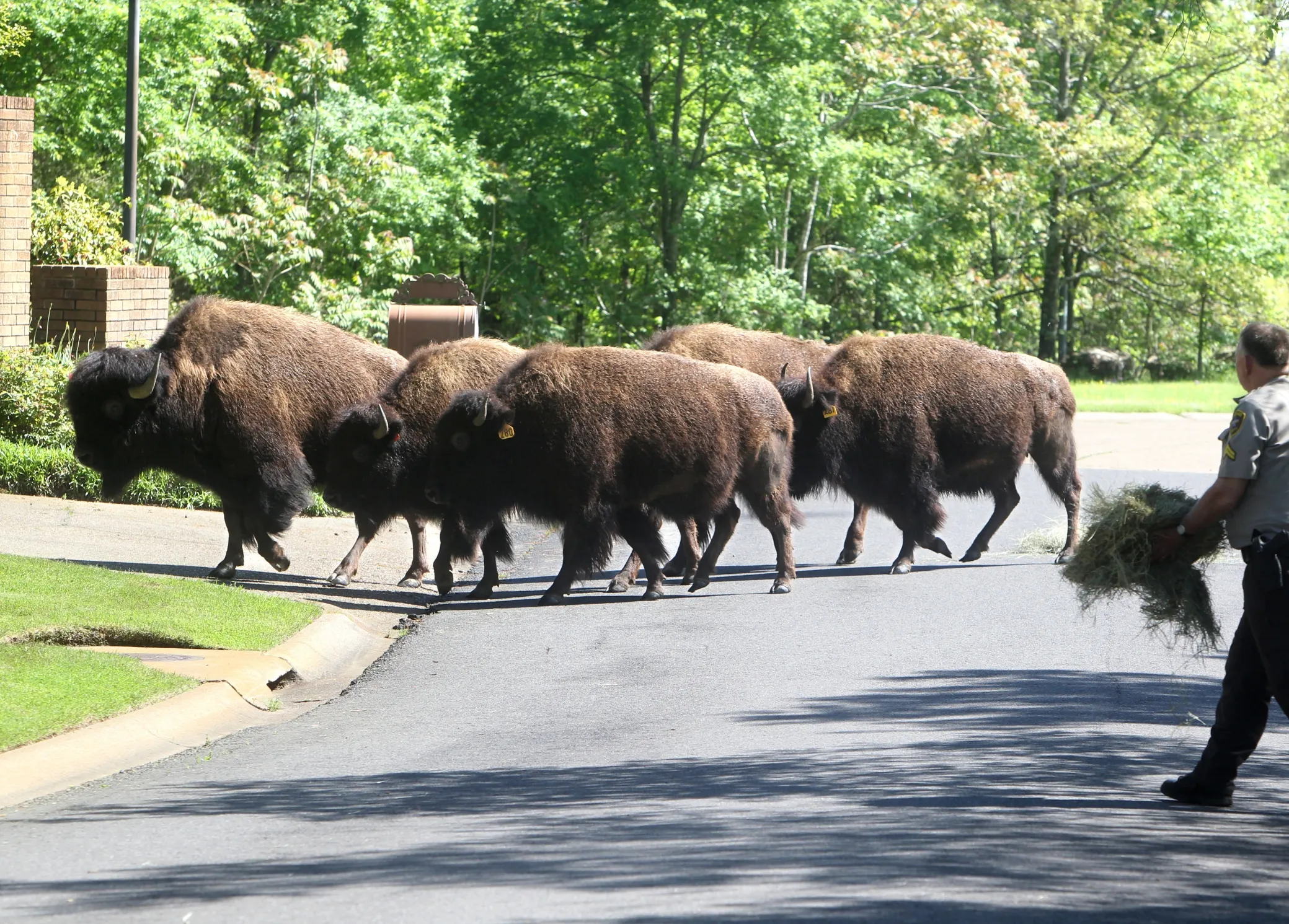 Garland County Sheriff's Department Cpl. Fred Hawthorn spreads some hay for five buffalo on Whispering Hills Road in Hot Springs, Ark., Thursday, April, 16, 2015. Hot Springs police say six buffaloes escaped from a nearby farm Thursday and spent the day roaming neighborhoods and avoiding sheriff's deputies, officers and volunteers. One animal was hit by a car and returned to the farm. Three were tranquilized Thursday evening. The whereabouts of the other two are unknown. (Richard Rasmussen/The Sentinel-Record via AP Photo)