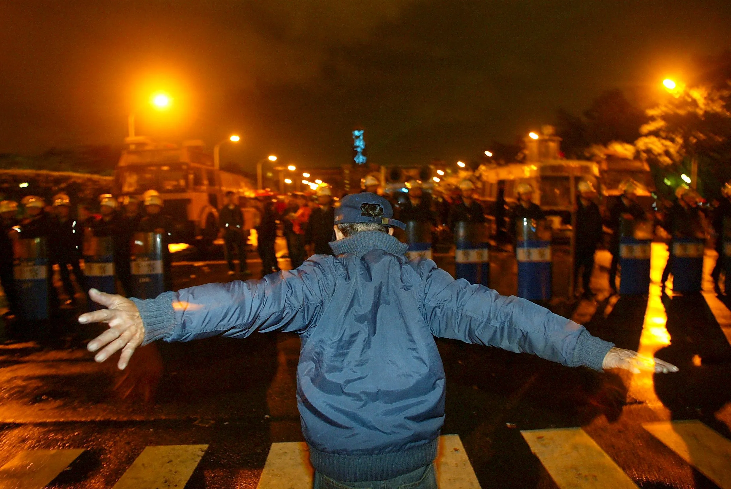 An opposition supporter gestures in front of riot police guarding the presidential palace in Taipei, in this March 21, 2004 file photo. (Photo by Thomas White/Reuters)