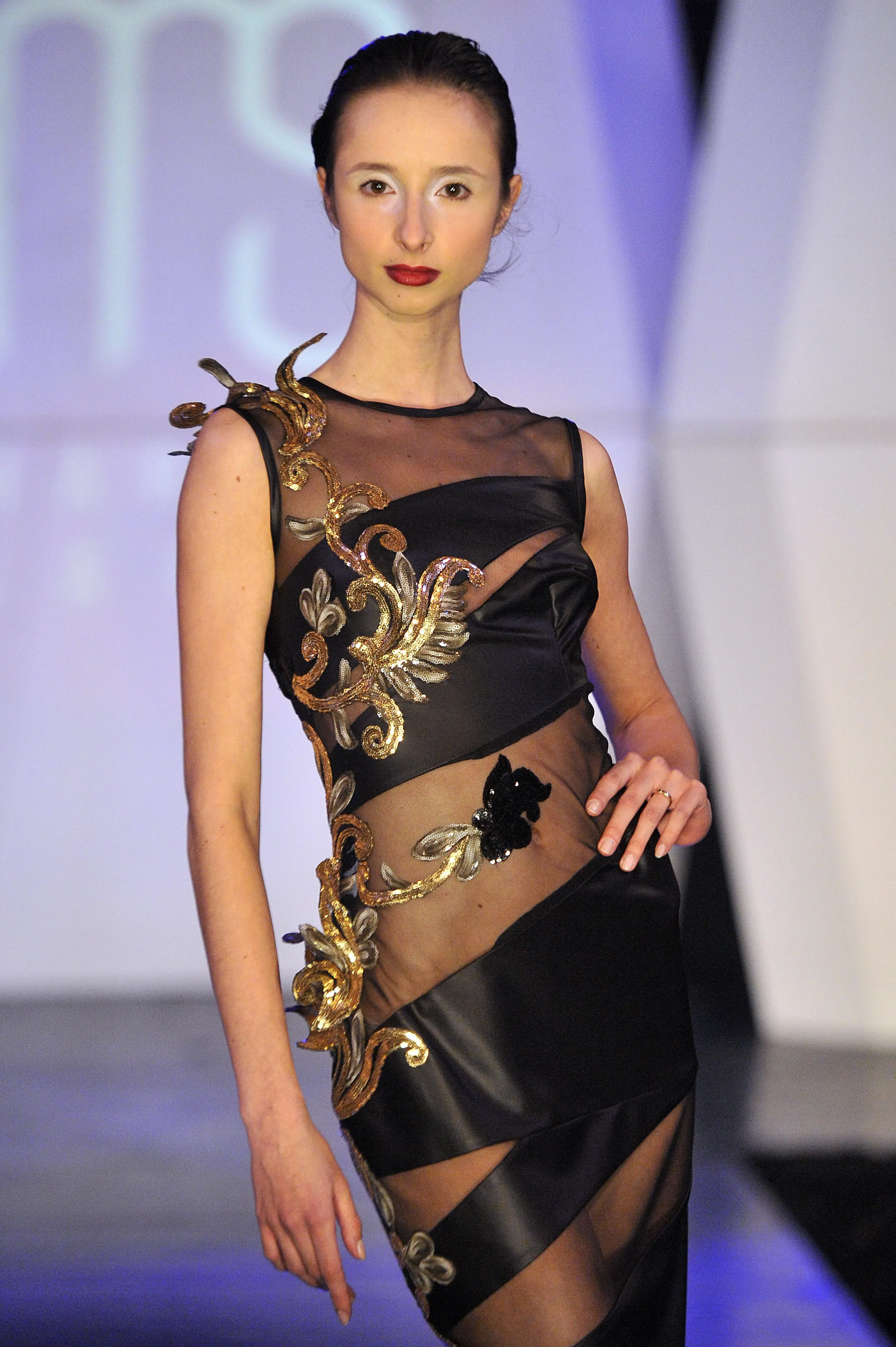A model wears a creation of Serbian fashion designer Marija Sabic on the third day of Budapest Fashion Week in PRLMNT cultural club in Budapest, Hungary, Friday, April 17, 2015. (Photo by Tamas Kovacs/MTI Photo via AP Photo)
