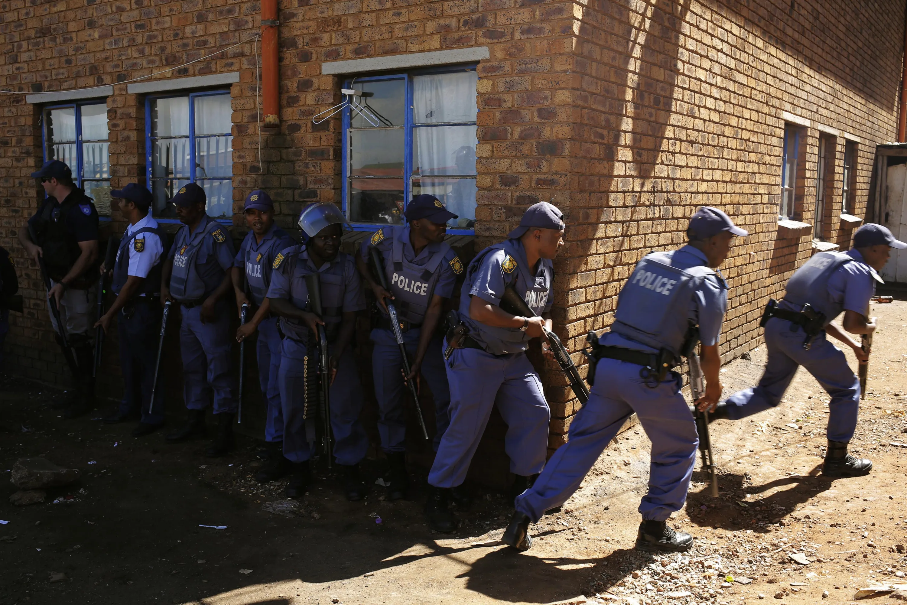 Police officers advance to enter mens hostels after xenophobic violence in the area overnight forced foreign shop owners to close their shops for fear of attack in Actonville, Johannesburg, South Africa, 16 April 2015. (Photo by Kim Ludbrook/EPA)