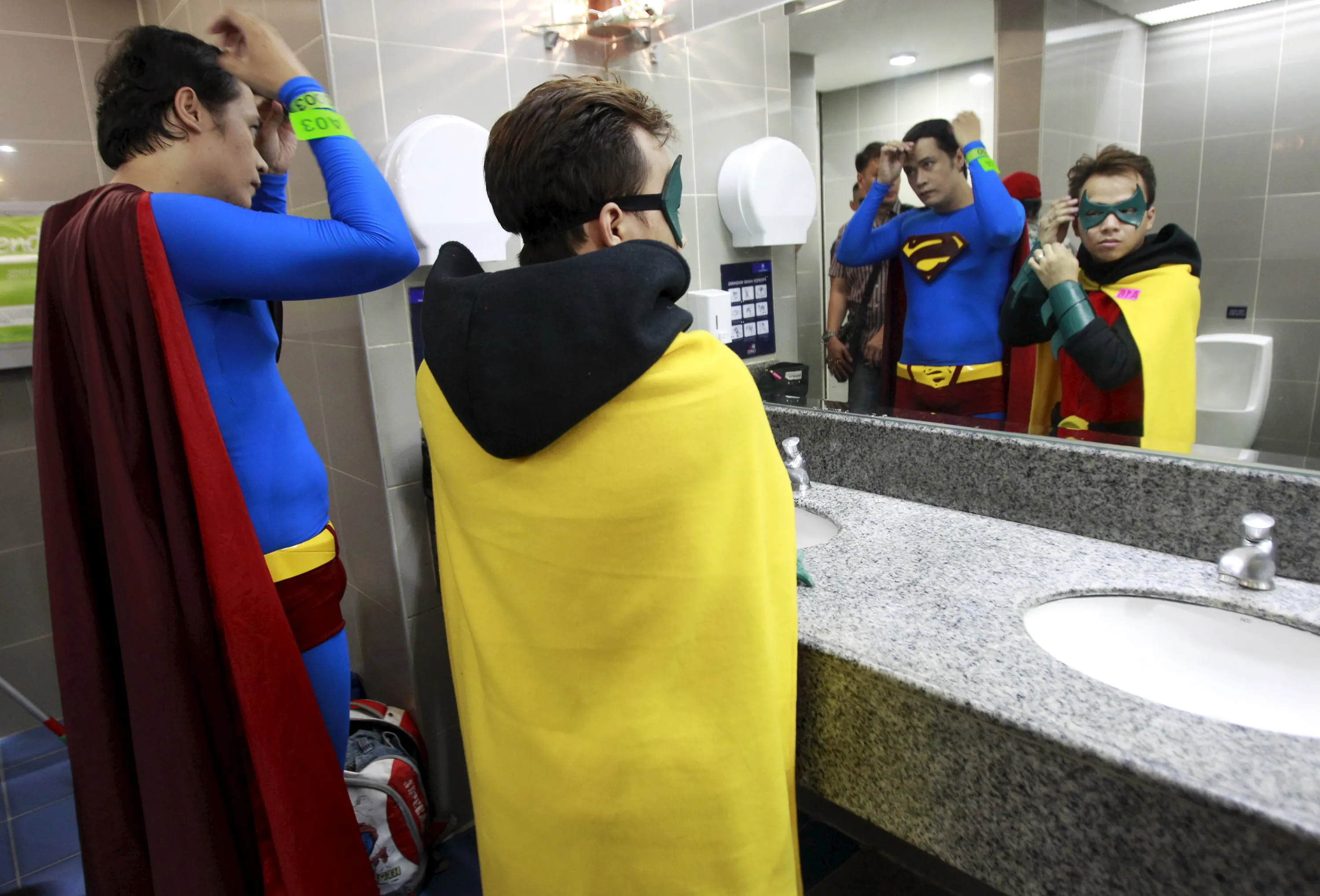 Participants wearing super heroes costume adjust their appearance at the mens room before joining the World DC Comics Super Heroes gathering in Manila April 18, 2015. (Photo by Romeo Ranoco/Reuters)