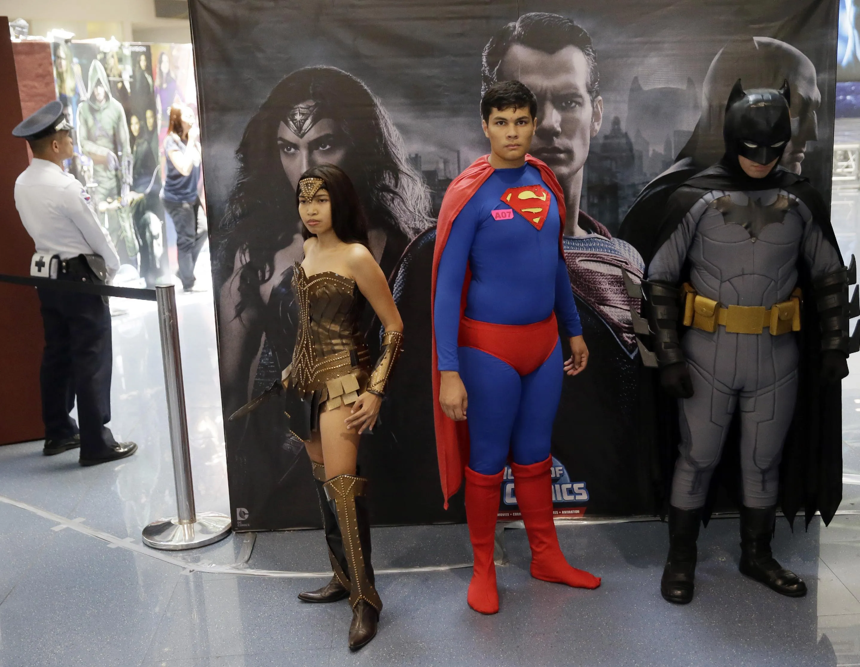 Filipino fans of DC comics super heroes pose at the country's largest shopping mall during an attempt to establish a world record for the most number wearing their favorite costumes Saturday, April 18, 2015 at suburban Quezon city, northeast of Manila, Philippines. (Photo by Bullit Marquez/AP Photo)