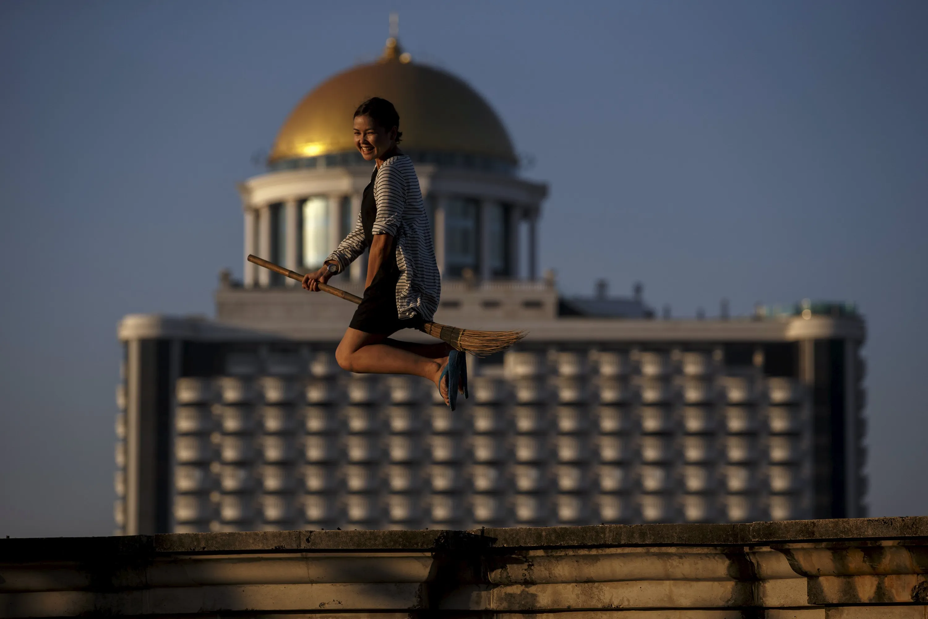 A visitor jumps with a broom on an unfinished structure of an abandoned building in Bangkok April 19, 2015. (Photo by Athit Perawongmetha/Reuters)