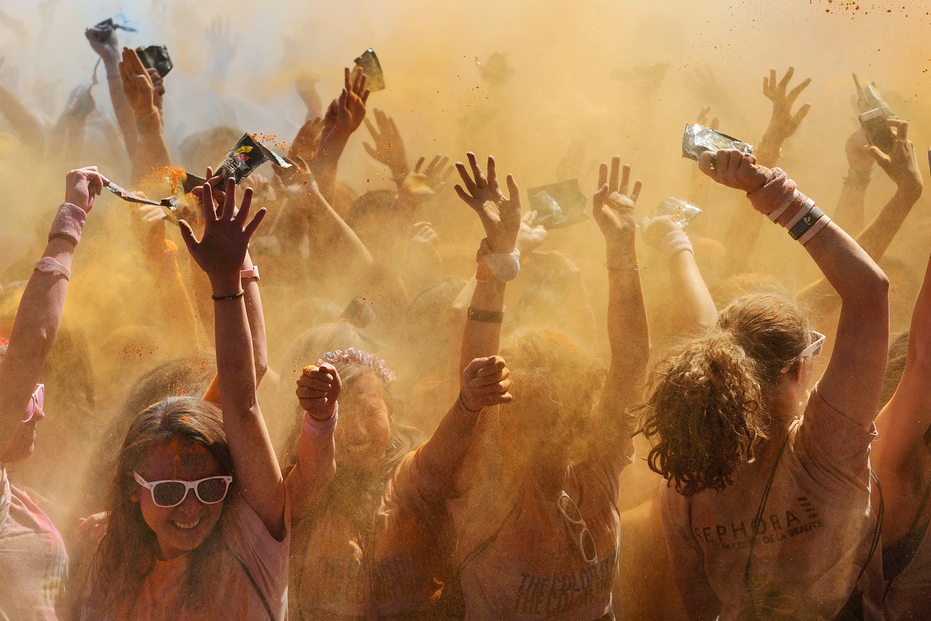 People take part in the Color Run near the Eiffel Tower, in Paris, France, Sunday, April 19, 2015. The Color Run is a 5 kilometer (3.1 mile) running event where participants are covered in bright colored powder at each check station and is less about speed and more about enjoying a day with friends and family. (Photo by AP Photo/Binta)