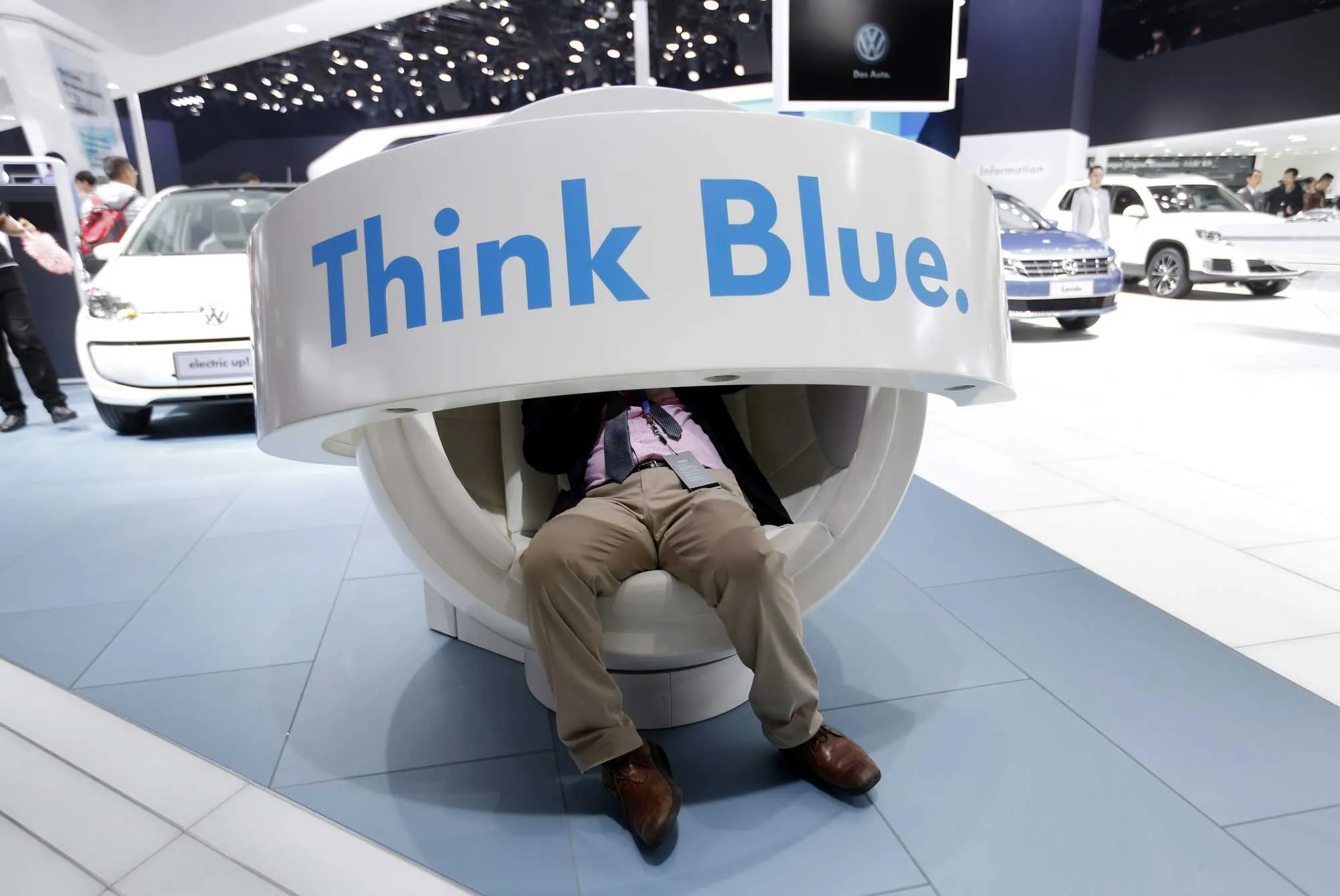 A visitor sits in a Volkswagen “Think Blue” slogan chair at the 16th Shanghai International Automobile Industry Exhibition in Shanghai, China, 20 April 2015. (Photo by How Hwee Young/EPA)