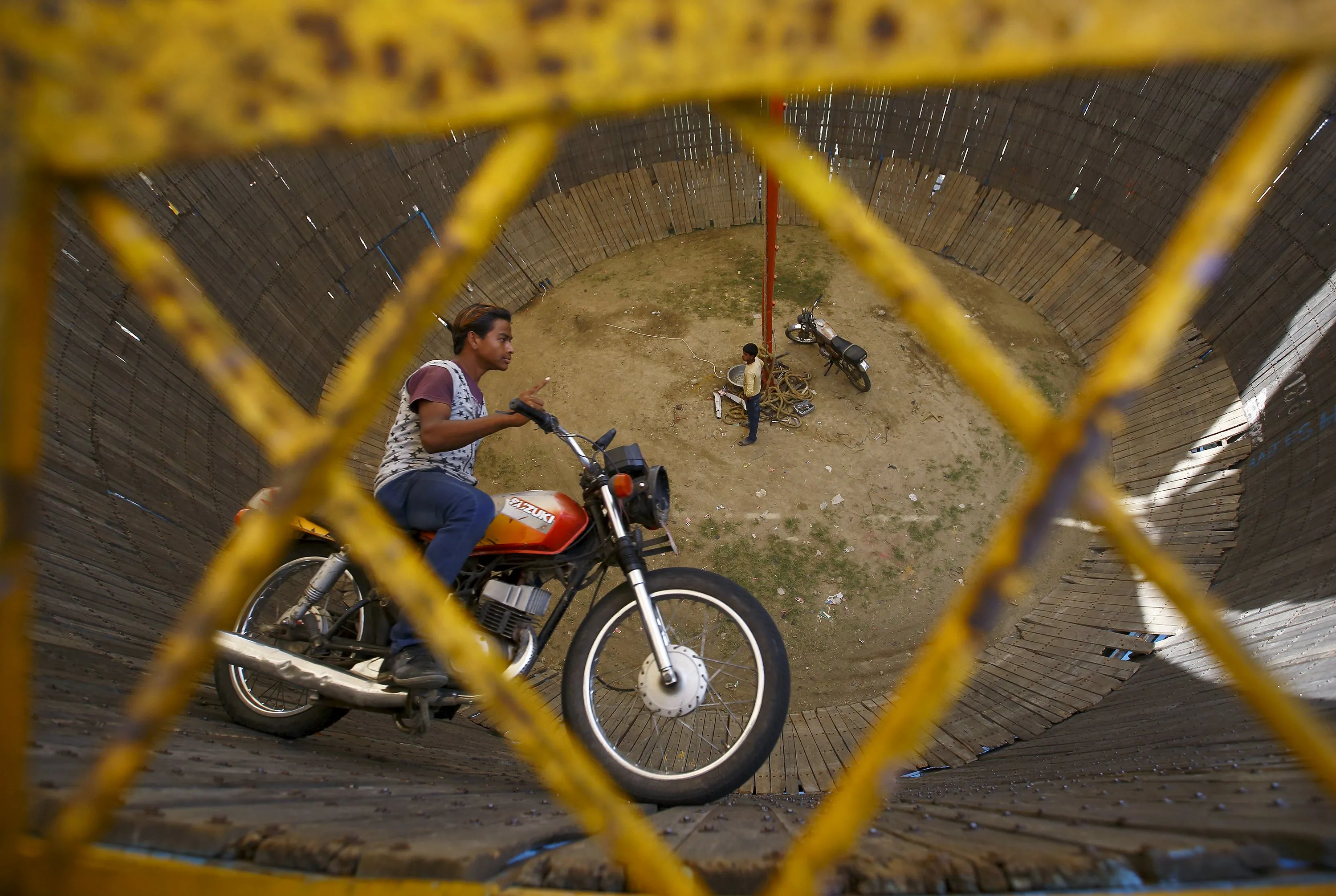 A stuntman rides a motorcycle inside the “Well of Death” attraction during a fair in Bhaktapur April 20, 2015. (Photo by Navesh Chitrakar/Reuters)