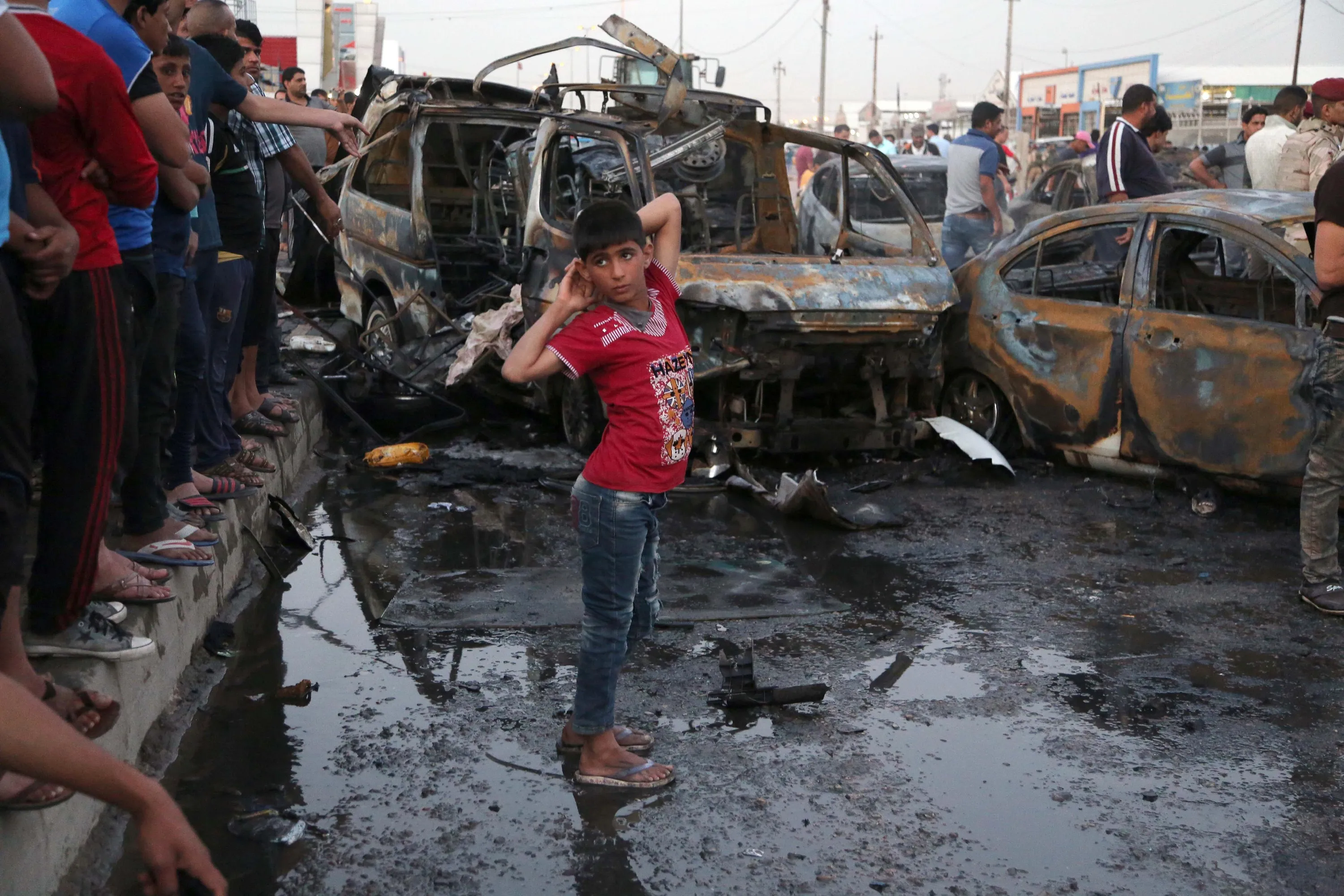 A boy watches as people and security forces gather at the scene of a car bomb explosion in Habibya in eastern Baghdad, Iraq, Friday, April 17, 2015. (Photo by Karim Kadim/AP Photo)