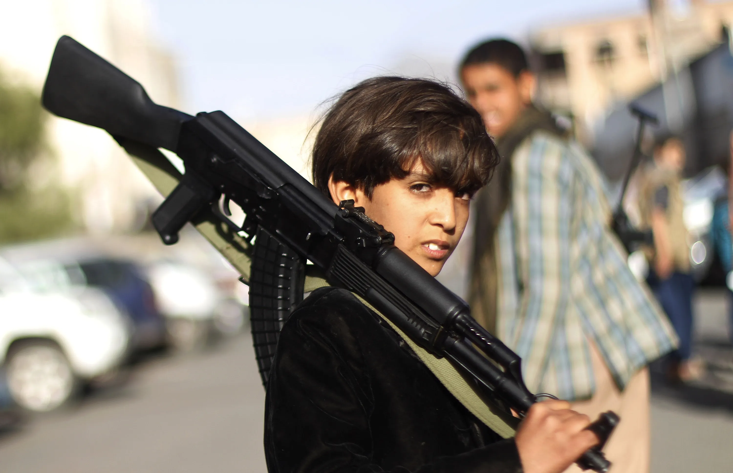 A Yemeni boy holding a weapon, poses for a picture during a demonstration against an arms embargo imposed by the U.N. Security Council on Houthi leaders, in Sanaa, Yemen, Thursday, April 16, 2015. (Photo by Hani Mohammed/AP Photo)