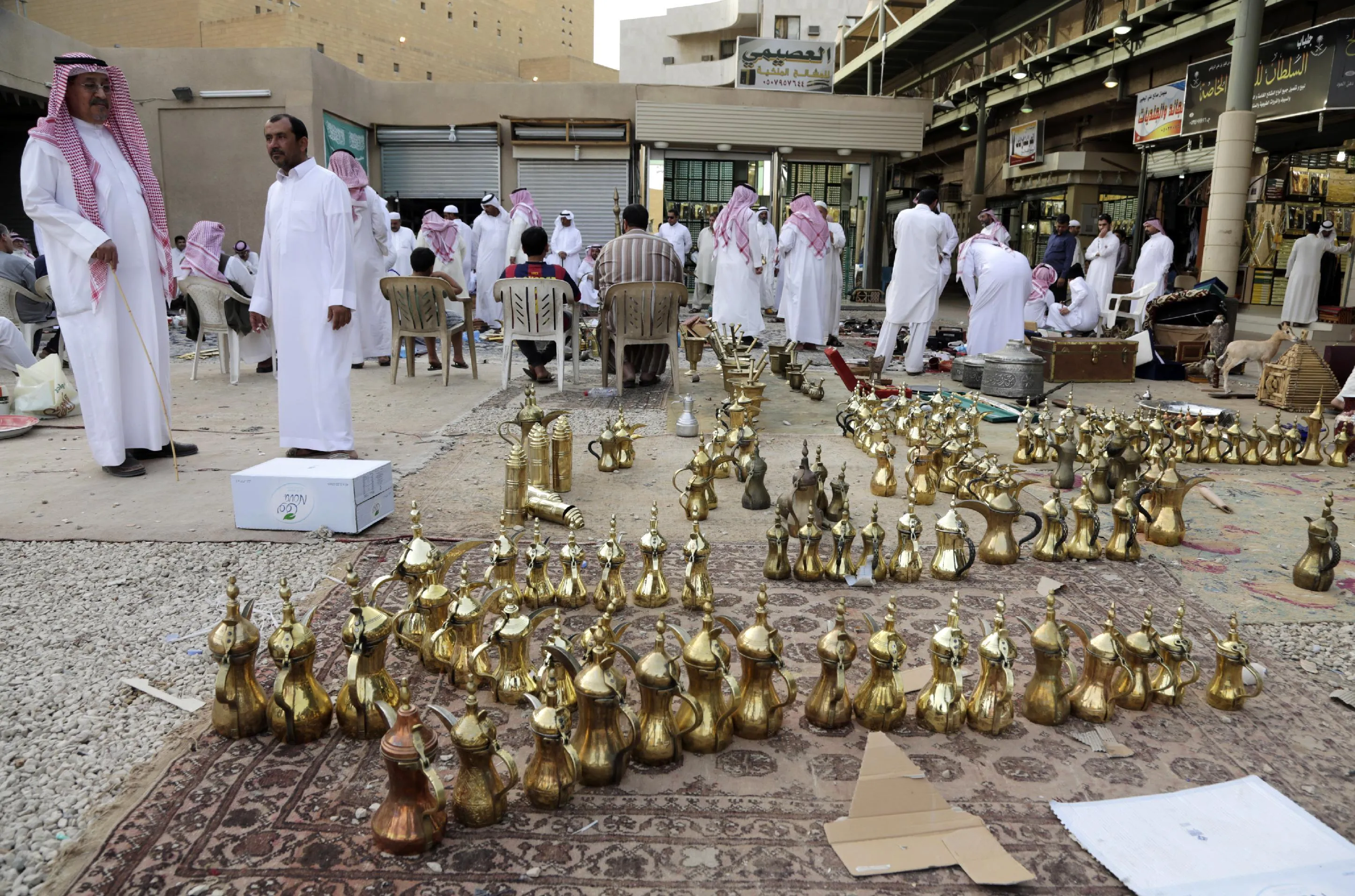 In this April 16, 2015 photo, traditional coffee pots are lined up for sale at al-Aqeeliya open-air auction market in Riyadh, Saudi Arabia. (Photo by Hasan Jamali/AP Photo)