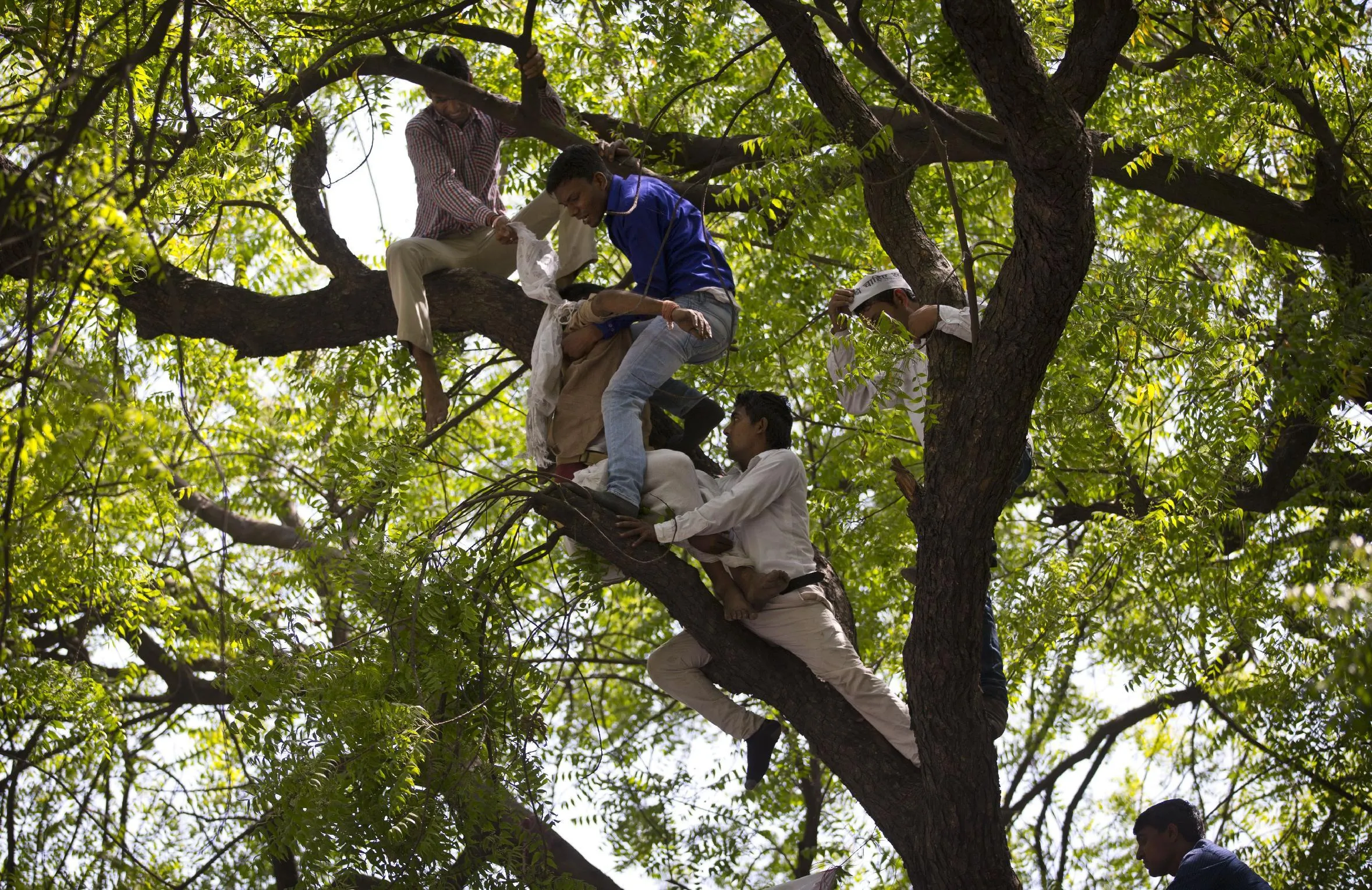 Volunteers of the Aam Admi Party try to rescue Gajendra Singh, who hanged himself during a farmer's rally in New Delhi, India, Wednesday, April 22, 2015. According to a note he left behind and which police recovered, Singh killed himself after his father, left with nothing after rainstorms destroyed their crops, forced him from the family home. It was the latest in a wave of suicides that has left at least 40 farmers dead in recent weeks. (Photo by Saurabh Das/AP Photo)