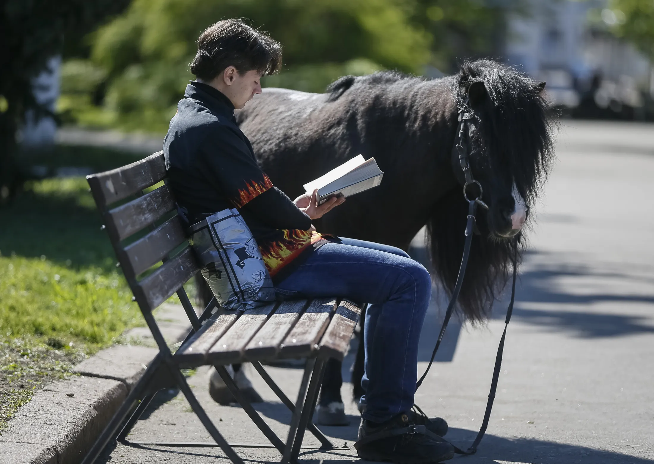 A man reads a book as his pony waits nearby, in central of Slaviansk, Ukraine April 26, 2014. (Photo by Gleb Garanich/Reuters)