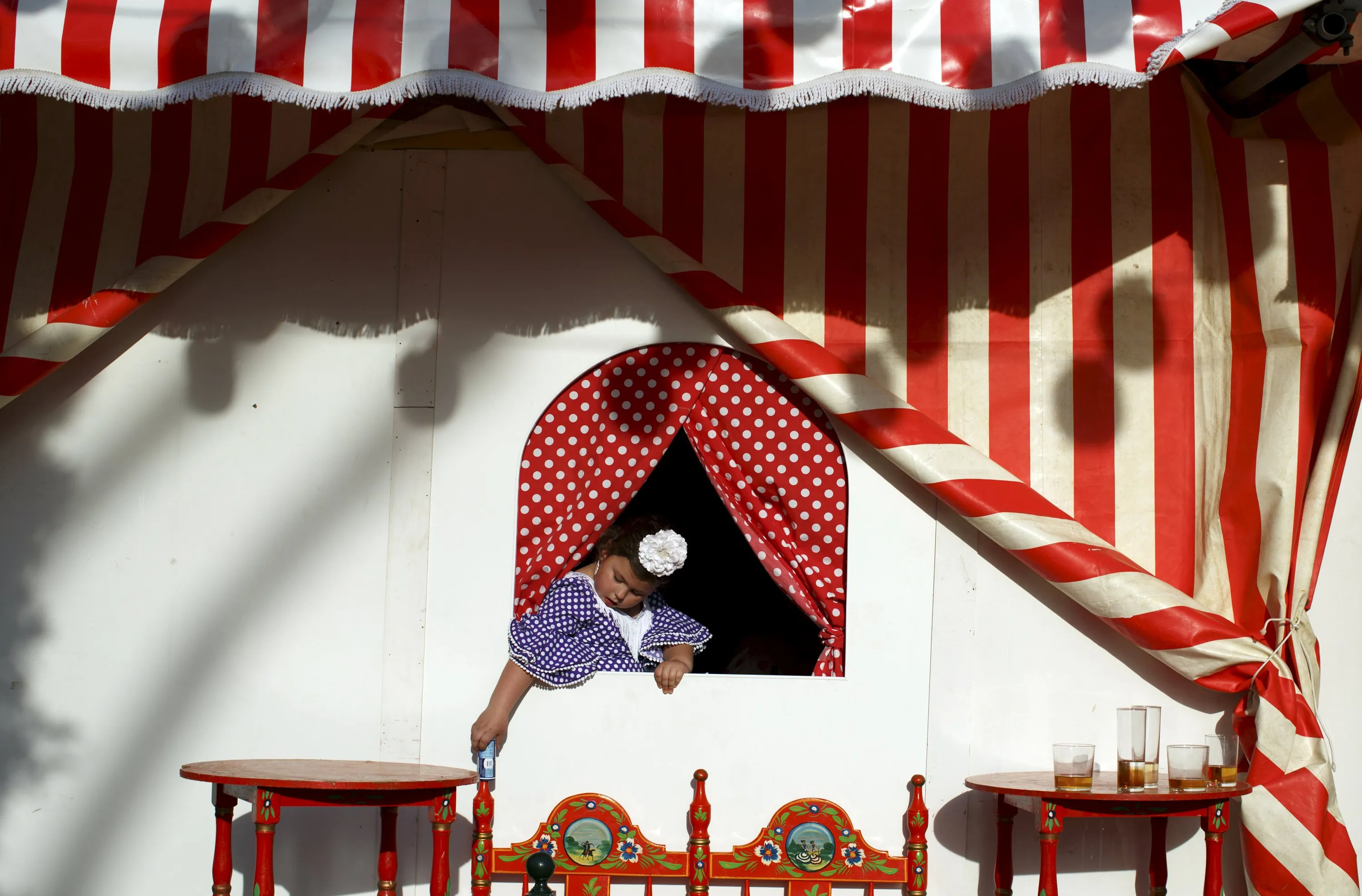 A girl wearing a sevillana dress plays alone during the traditional Feria de Abril (April fair) in the Andalusian capital of Seville, southern Spain April 22, 2015. (Photo by Marcelo del Pozo/Reuters)