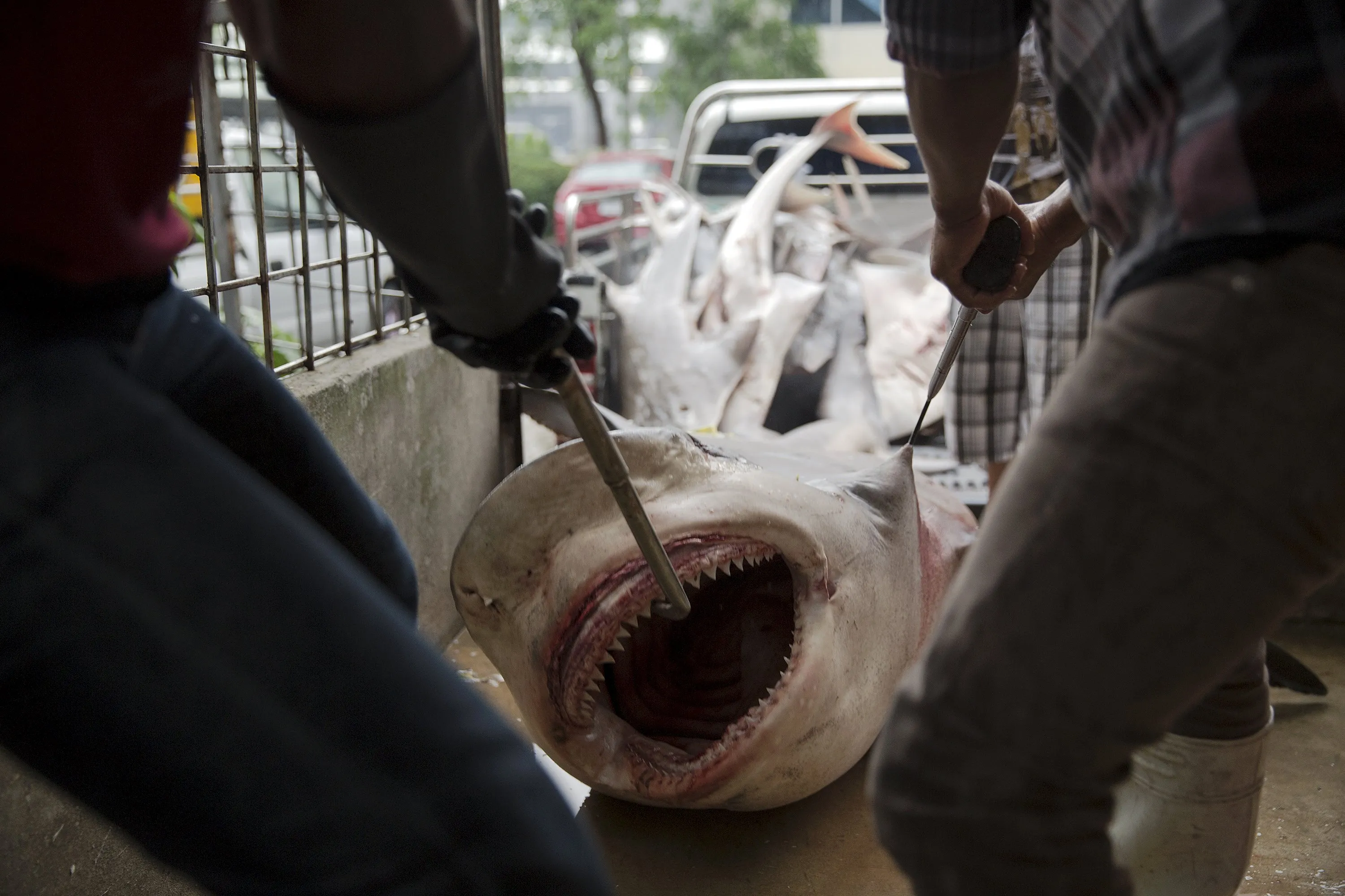 People use metal hooks as they move a shark inside a house near a wholesale market for fish and other seafood in Mahachai, in Thailand's Samut Sakhon province April 23, 2015. (Photo by Damir Sagolj/Reuters)