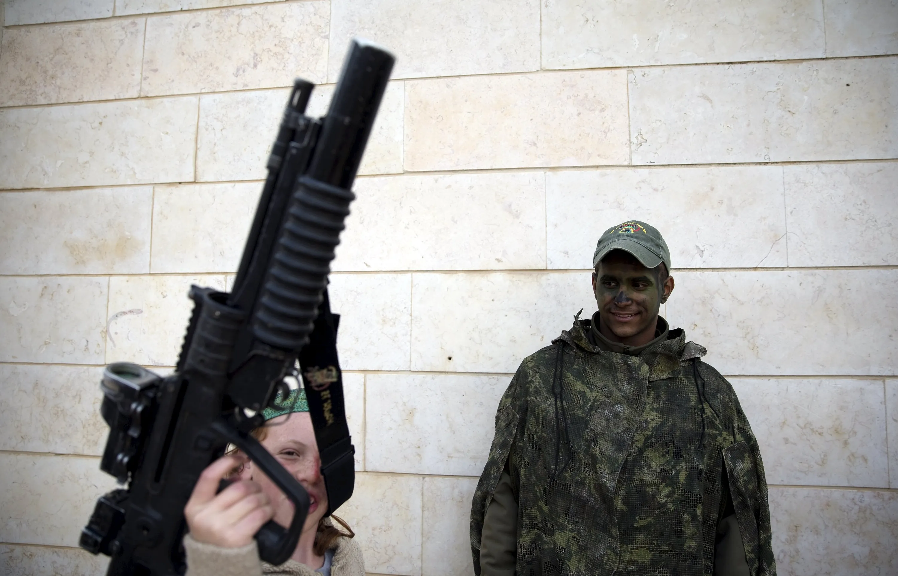 An Israeli soldier stands next to a boy holding a rifle during a display of the Israeli Defense Forces (IDF) equipment and abilities at the West Bank settlement of Kiryat Arba April 23, 2015. during celebrations for Israel's Independence Day, marking the 67th anniversary of the creation of the state. (Photo by Ronen Zvulun/Reuters)