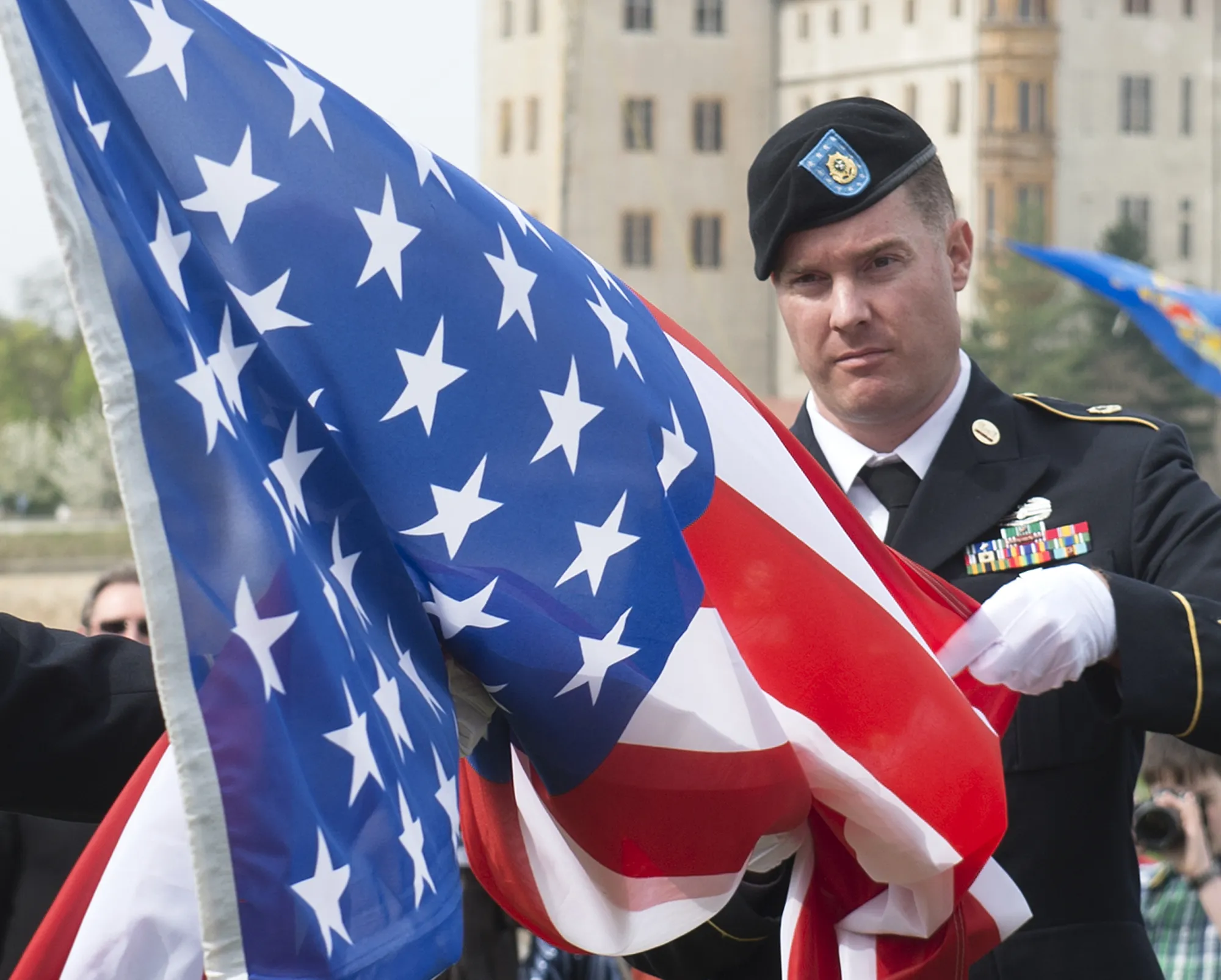 A US soldier hoists the US flag during the 70th anniversary celebrations of the Elbe Day in Torgau, eastern Germany, Saturday, April 25, 2015. The WW II link-up of US and Soviet Forces occurred here at the river Elbe on April 25, 1945. (AP Photo/Jens Meyer)