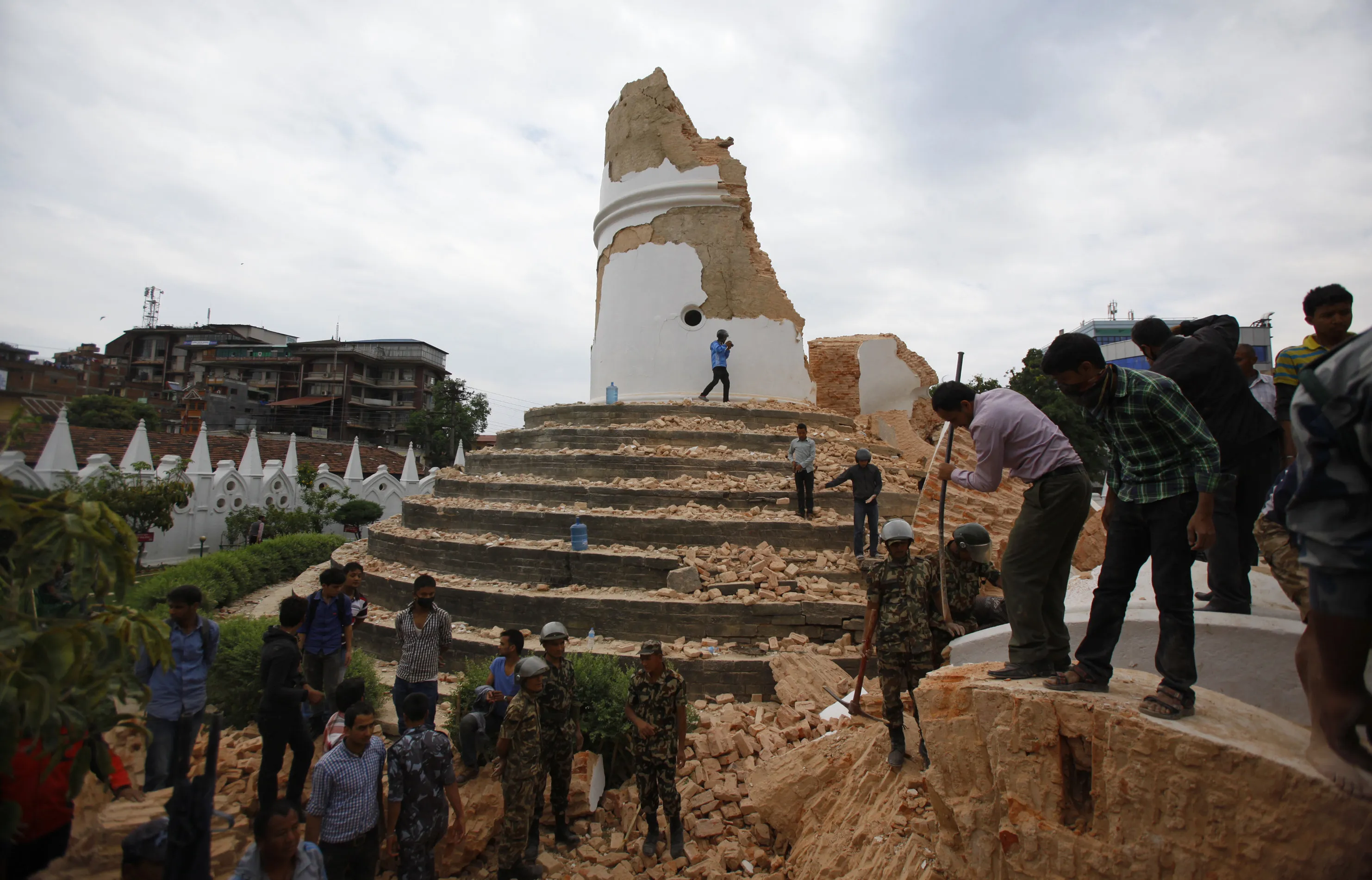 Volunteers work to remove debris at the historic Dharahara tower, a city landmark, after an earthquake in Kathmandu, Nepal, Saturday, April 25, 2015. (Photo by Niranjan Shrestha/AP Photo)