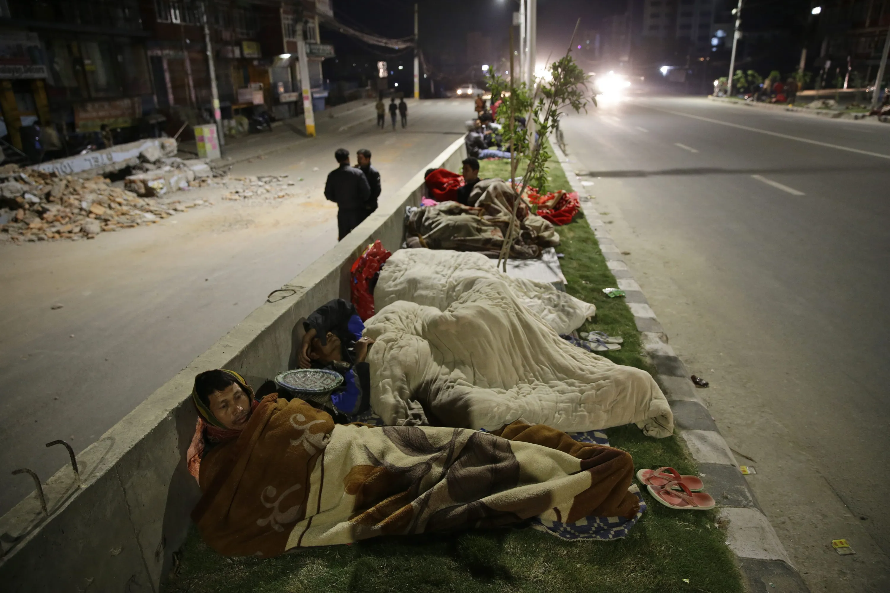 People sleep outside on a street a in Kathmandu, Nepal, 25 April 2015 following a massive earthquake. Hundreds of people died and many more were feared trapped in rubble on 25 April 2015 after a magnitude-7.9 earthquake devastated Nepal's capital and triggered a deadly avalanche on Mount Everest. (Photo by Narendra Shrestha/EPA)