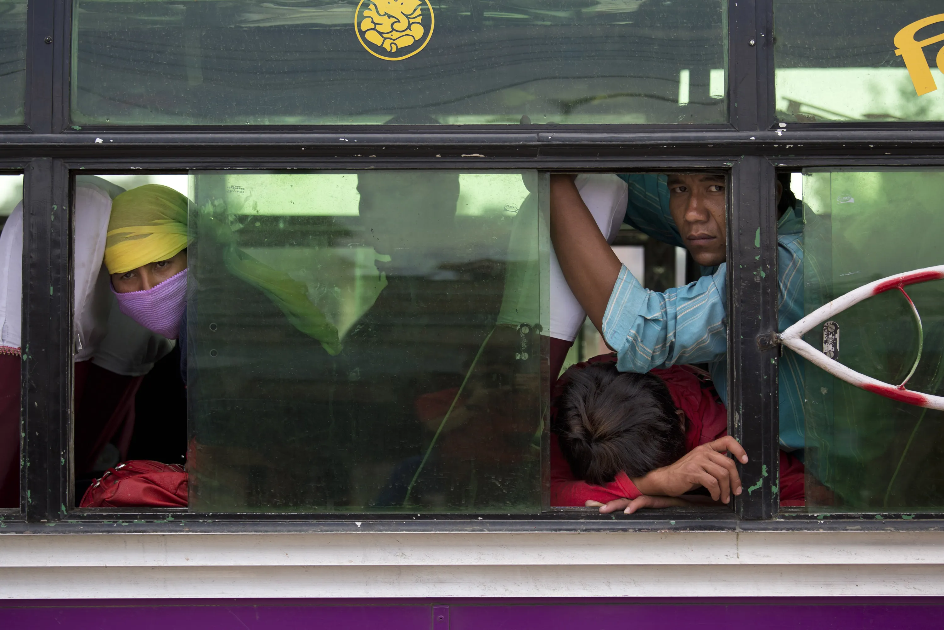 Nepalese people look out from inside a bus where they have taken shelter as it is considered safer in cars than inside houses with repeated aftershocks, in Kalanki neighbourhood of Kathmandu, Nepal, Sunday, April 26, 2015. (Photo by Bernat Armangue/AP Photo)