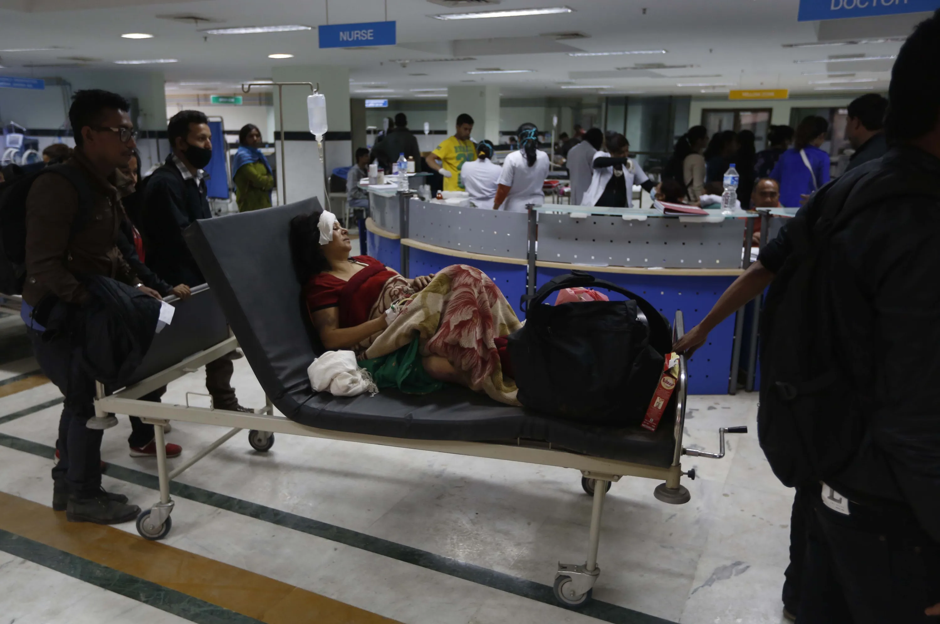 An earthquake injured woman lies on a mobile bed at a hospital in Kathmandu, Nepal, Sunday, April 26, 2015. (Photo by Manish Swarup/AP Photo)