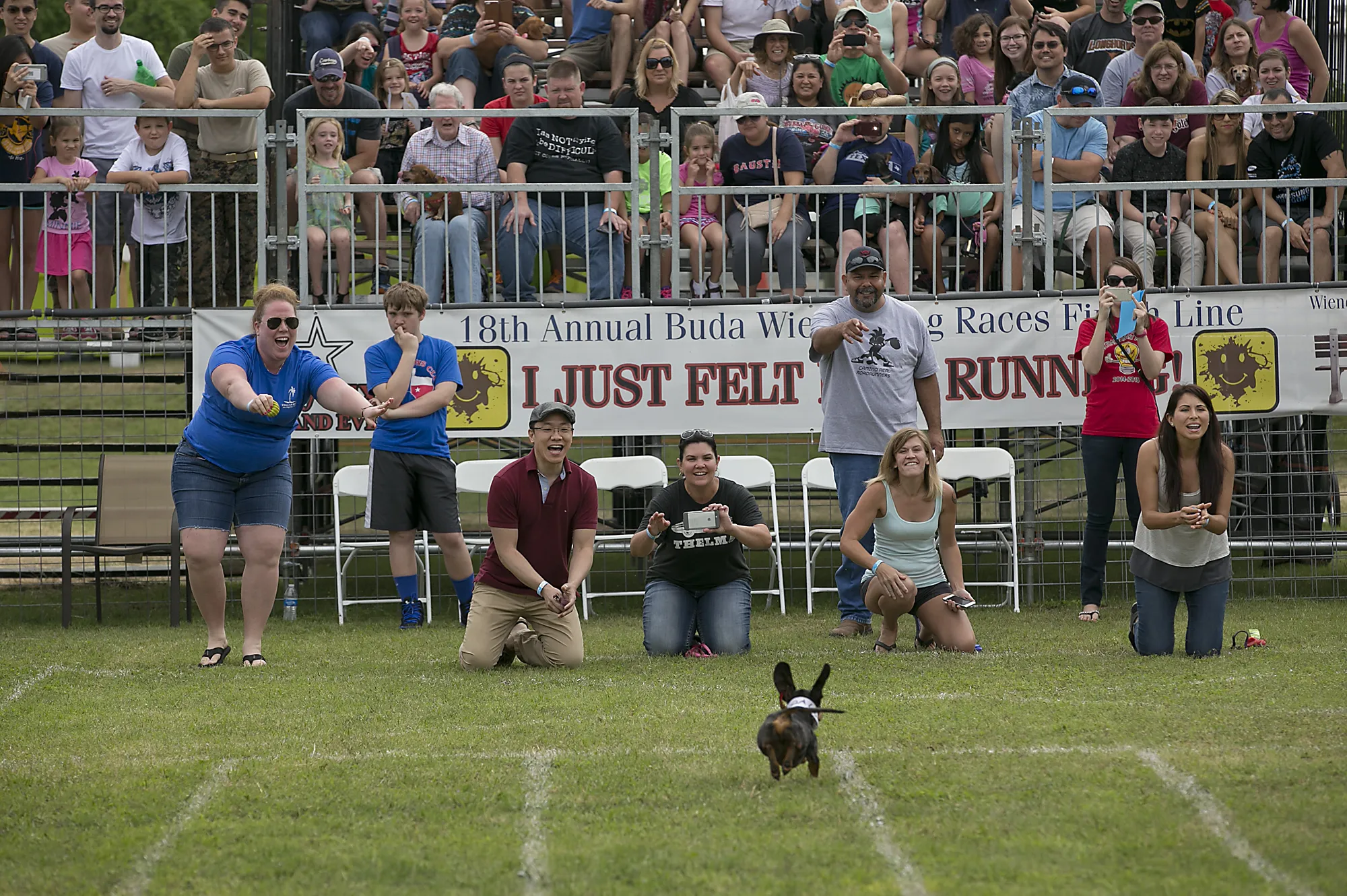 Ashley Nolan, left, cheers on her dog Hank Williams as he finishes first in his heat to advance to the quarterfinals. The 18th Annual Buda County Fair and Weiner Dog Races was held at city park in Buda Sunday April 26, 2015 sponsored by the Lions Club. (Photo by Ralph Barrera/Austin American-Statesman)