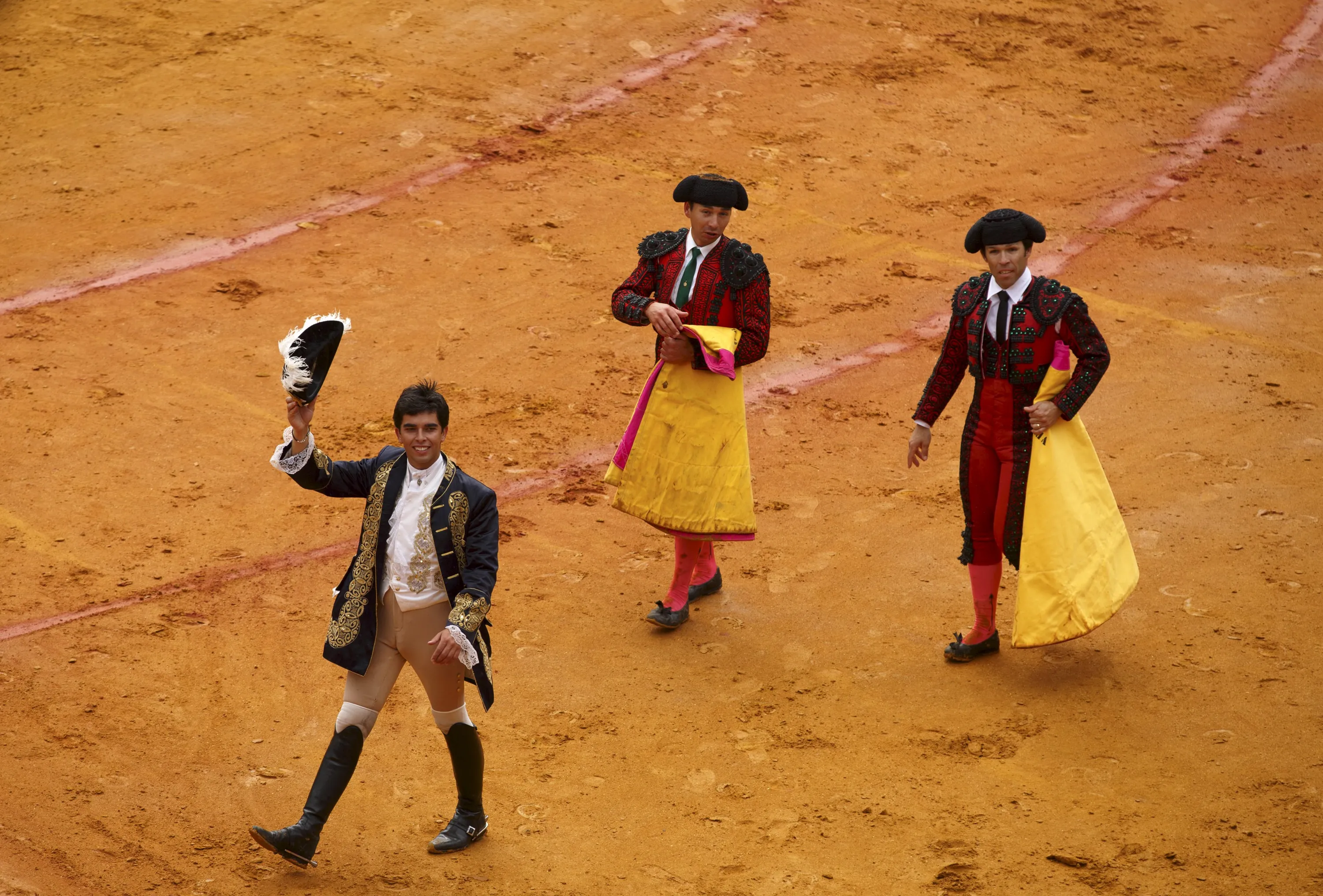 Portuguese rejoneador (mounted bullfighter) Joao Moura (L) celebrates his performance next to his assistants during a bullfight at The Maestranza bullring in the Andalusian capital of Seville, southern Spain April 26, 2015. (Photo by Marcelo del Pozo/Reuters)