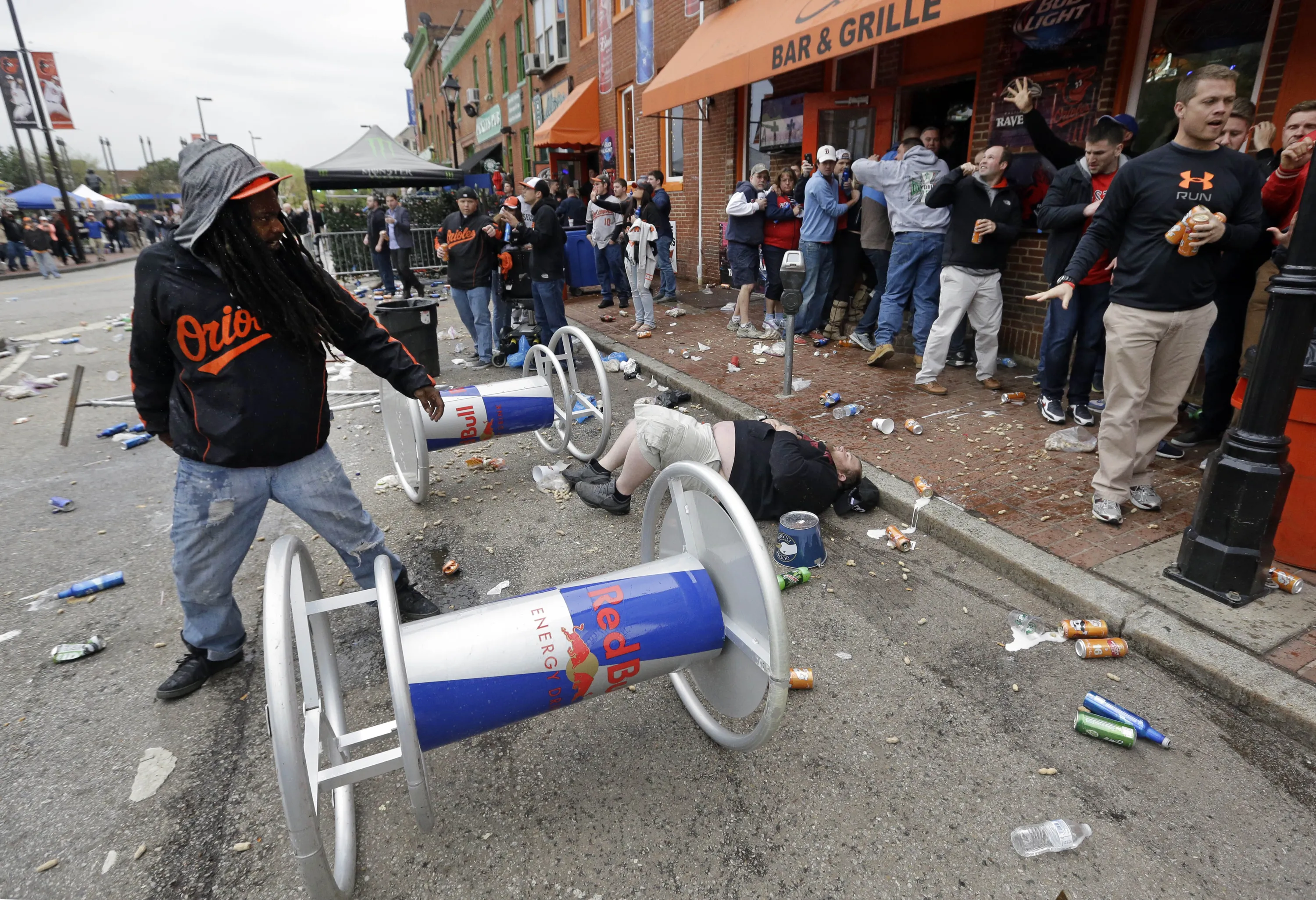 An bar patron lies on the ground after a skirmish with a protester after a rally for Freddie Gray, Saturday, April 25, 2015, in Baltimore. (Photo by Patrick Semansky/AP Photo)