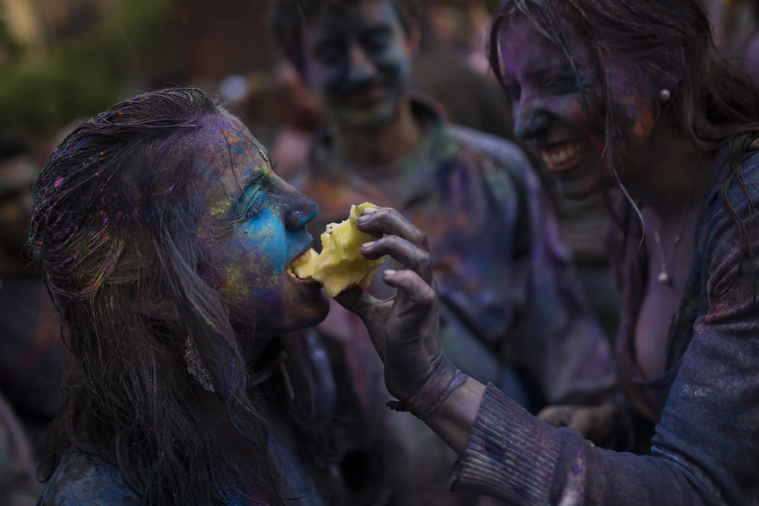 A reveler shares an apple with her friend during a Holi Festival in Madrid, Spain, Sunday, April 26, 2015. (Photo by Andres Kudacki/AP Photo)
