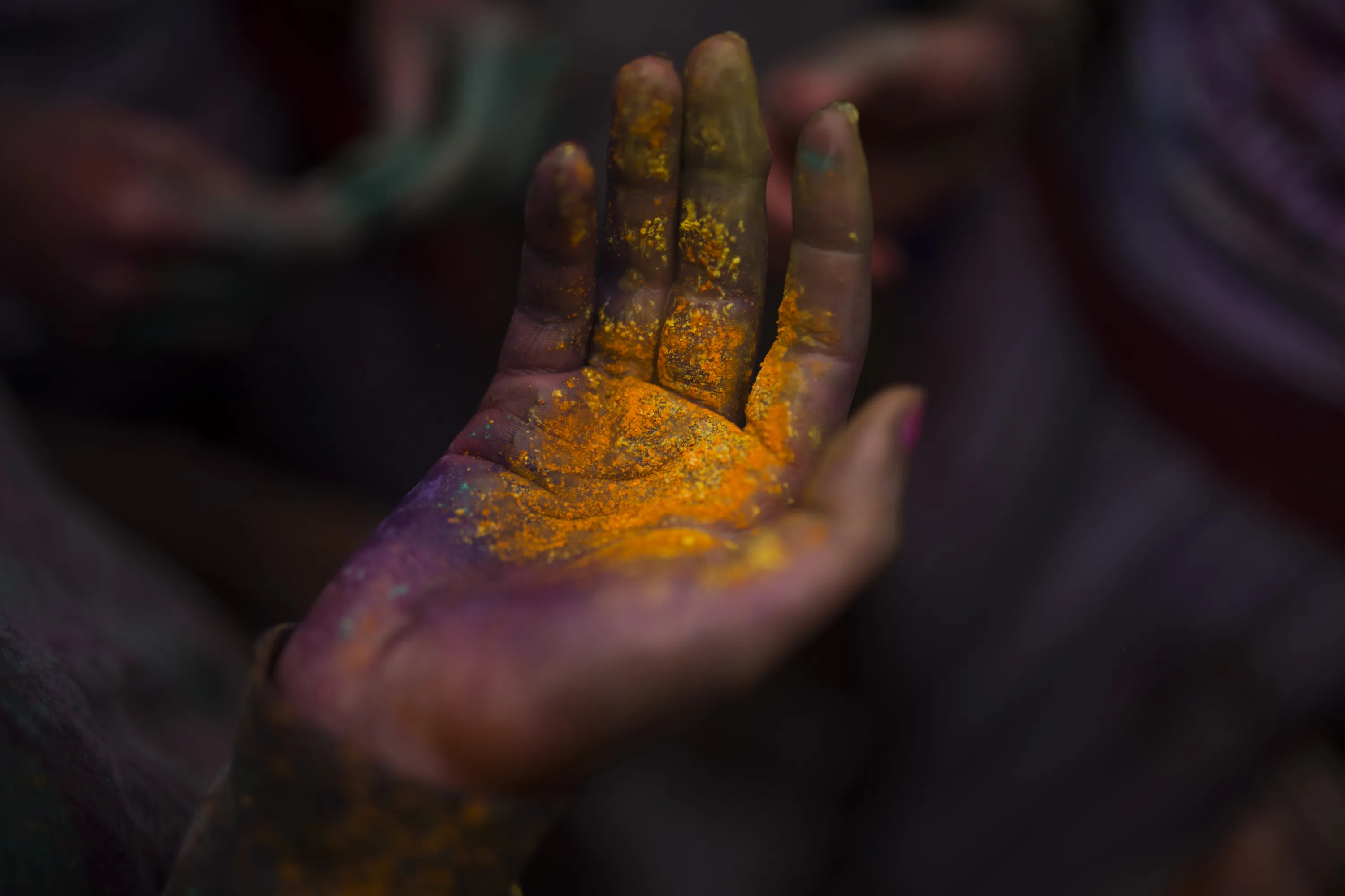 A reveler holds her hand full of powder during a Holi Festival in Madrid, Spain, Sunday, April 26, 2015. (Photo by Andres Kudacki/AP Photo)