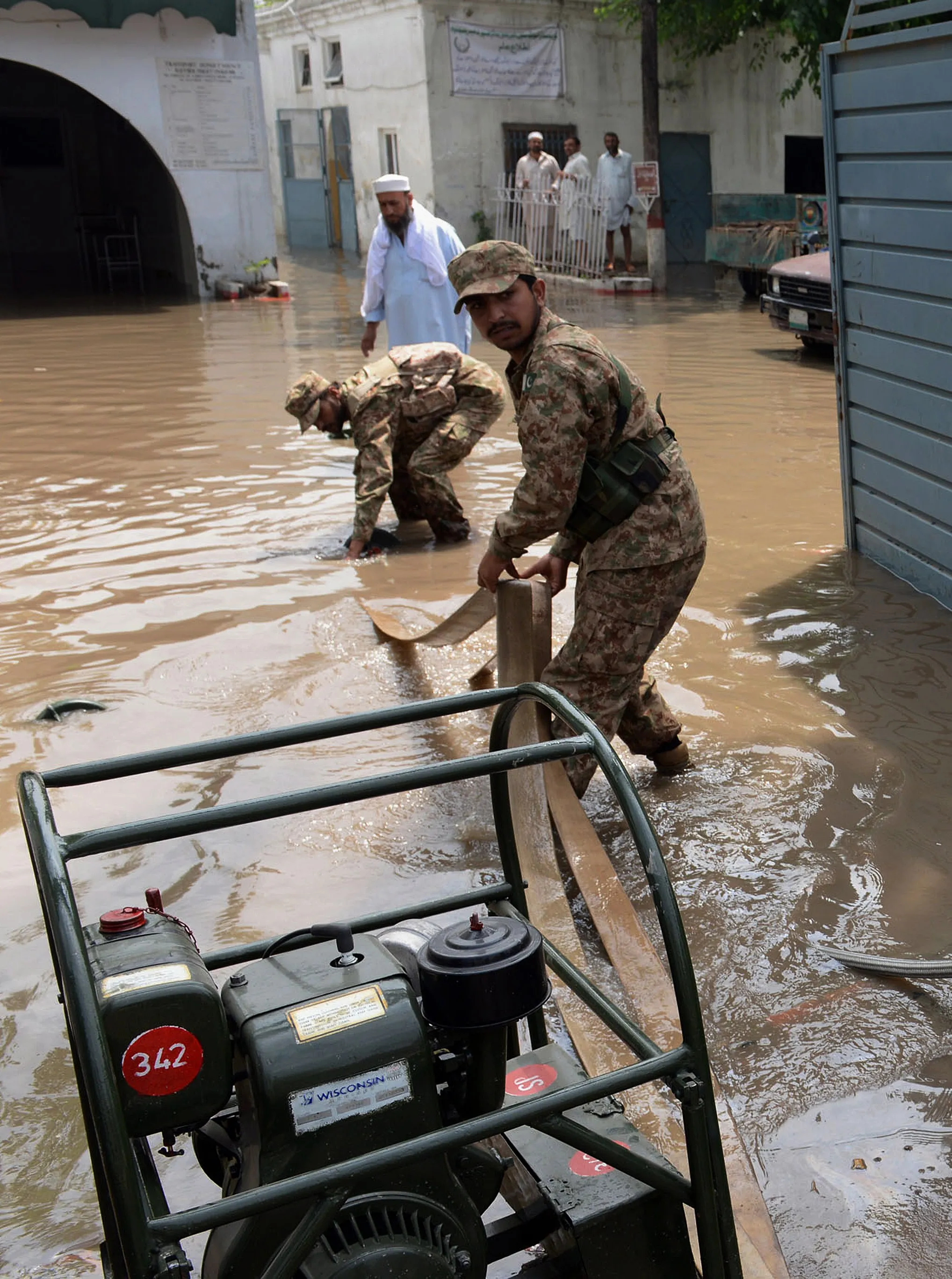 Pakistani soldiers pump rain water from a residential area following heavy rain and winds in Peshawar on April 27, 2015. A severe storm in northwest Pakistan, dubbed a “mini-cyclone”, has killed 44 people and injured more than 200, officials said, raising their previous death toll. (Photo by A. Majeed/AFP Photo)