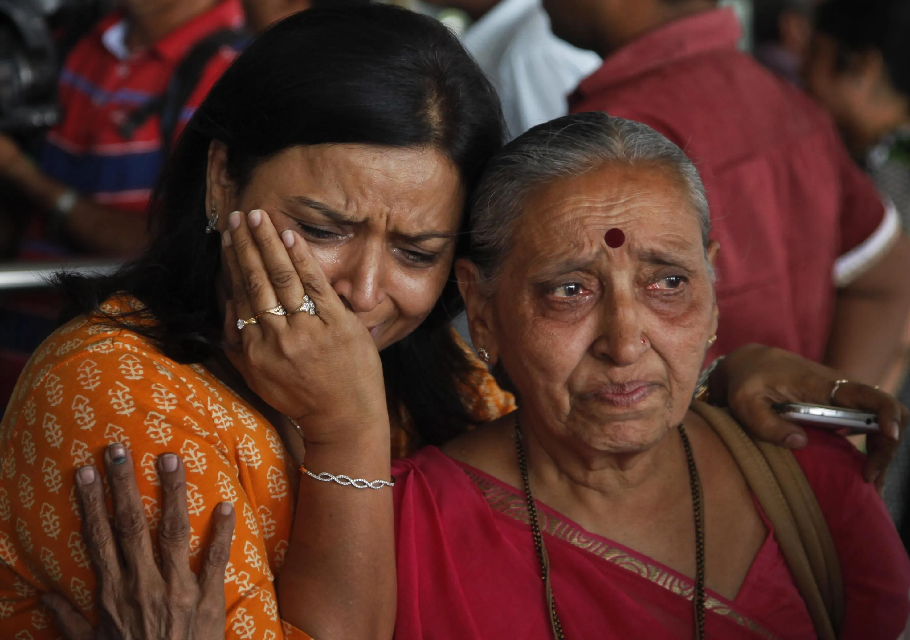 An Indian woman cries as her relative, right who was on pilgrimage in Nepal during Saturday�s earthquake, returned at the airport in Ahmadabad, India, Monday, April 27, 2015. The earthquake was the worst to hit the South Asian nation in more than 80 years. It and was strong enough to be felt all across parts of India, Bangladesh, China's region of Tibet and Pakistan. (Photo by Ajit Solanki/AP Photo)