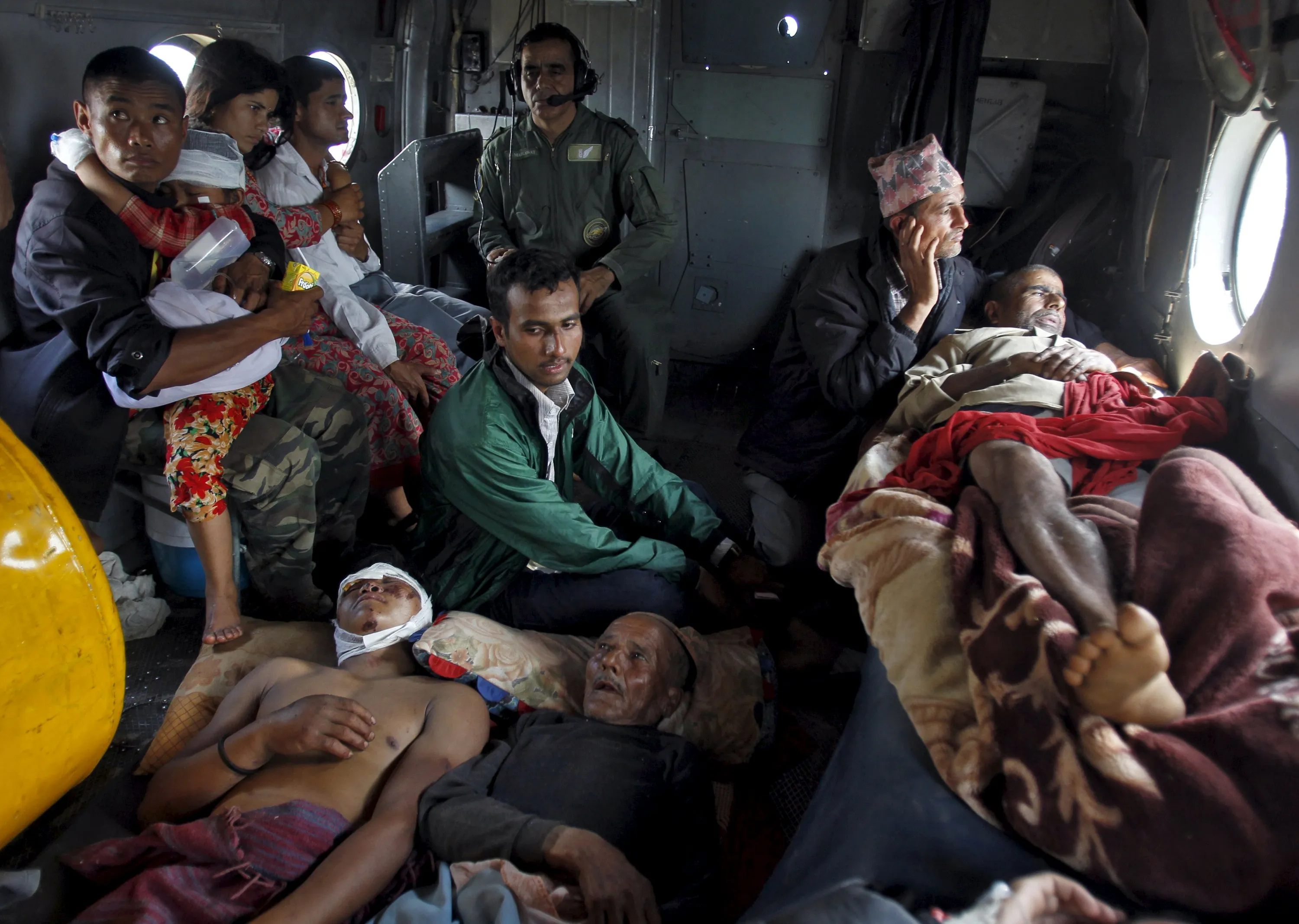Victims of Saturday's earthquake rest inside an Indian Air Force helicopter as they are evacuated from Trishuli Bazar to the airport in Kathmandu, Nepal, April 27, 2015. (Photo by Jitendra Prakash/Reuters)