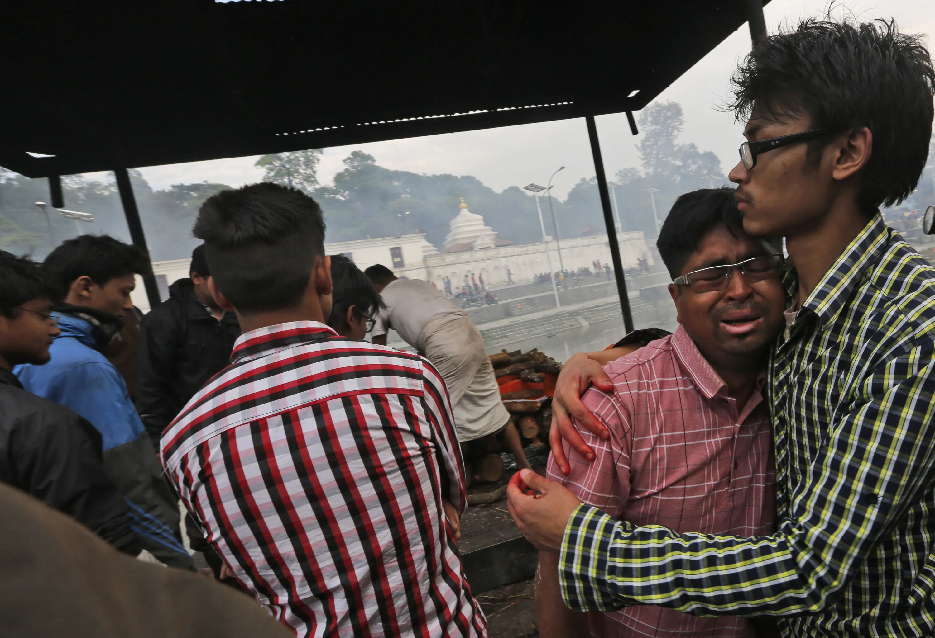 A Nepalese man consoles his friend during the cremation of his relative killed in the recent earthquake, at the Pashupatinath temple, on the banks of Bagmati river, in Kathmandu, Nepal, Monday, April 27, 2015. (Photo by Manish Swarup/AP Photo)