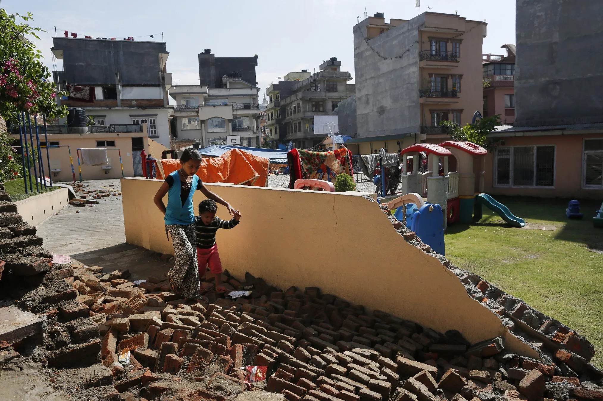 A young girl walks with a boy over a collapsed school playground in Kathmandu, Nepal, Monday, April 27, 2015. (Photo by Wally Santana/AP Photo)
