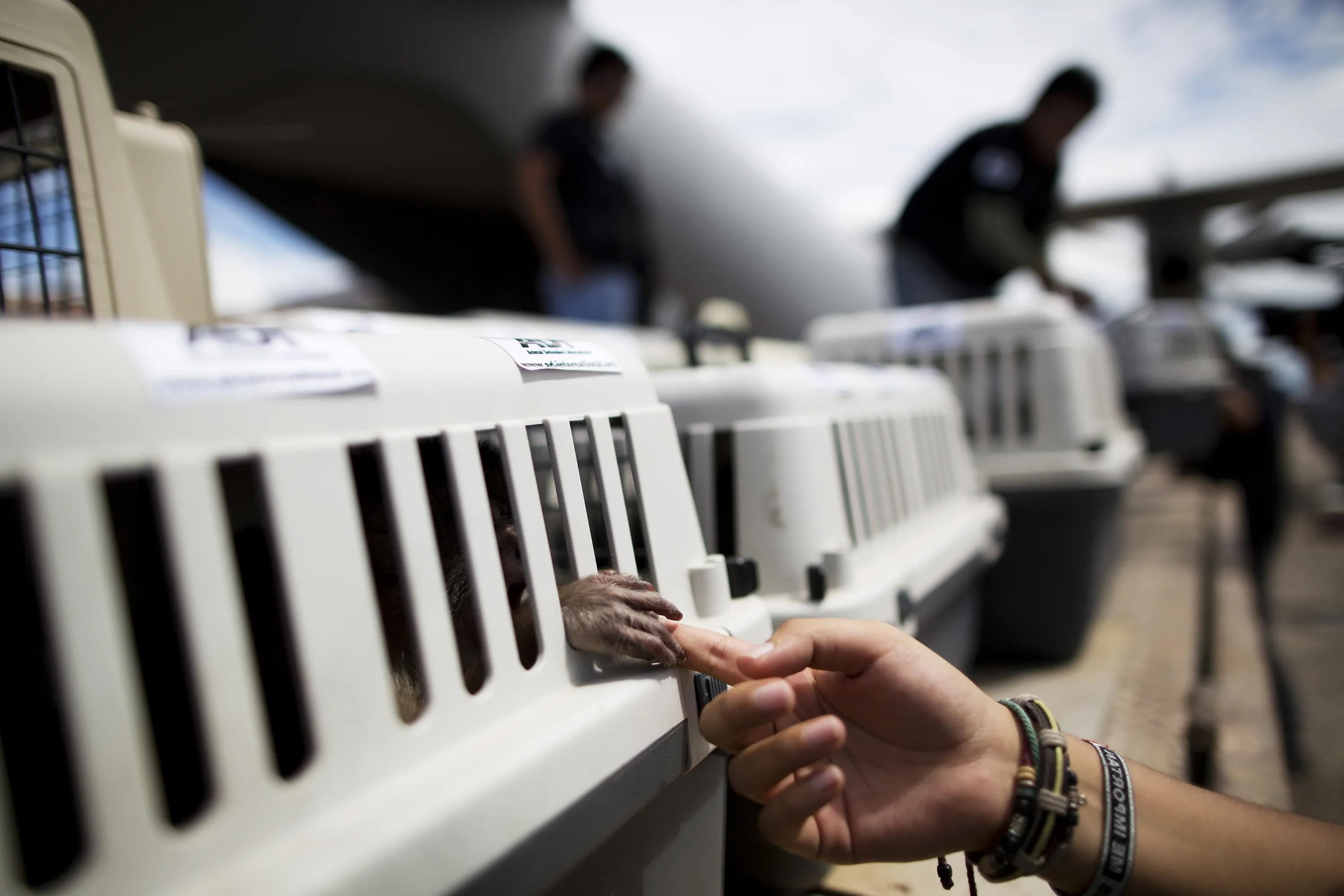 In this April 18, 2015 photo, a monkey holds onto the finger of an Animal Defenders International worker, as pet carriers housing rescued animals are unloaded from a military aircraft at the airport in Iquitos, Peru. (Photo by Rodrigo Abd/AP Photo)