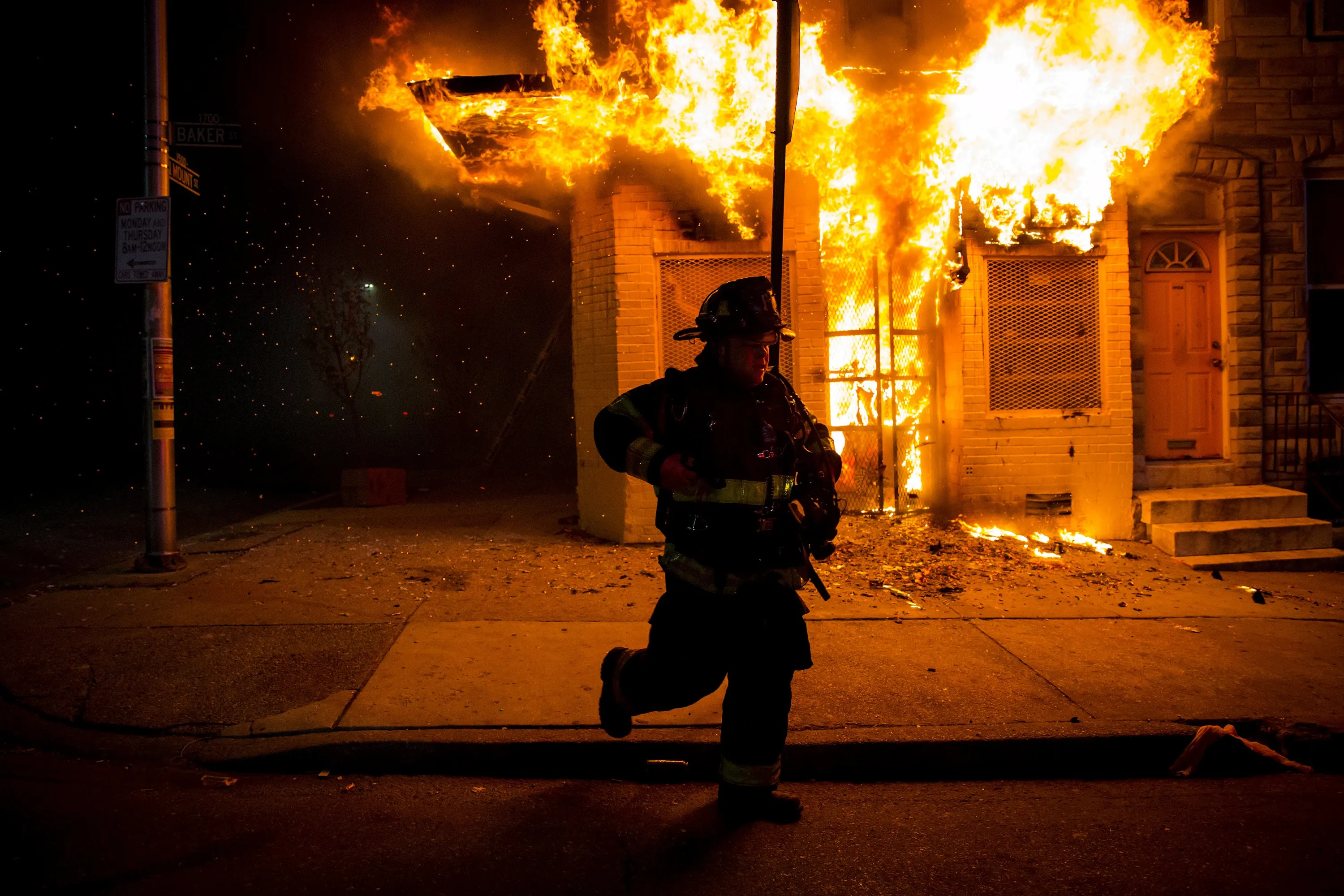 Baltimore firefighters attack a fire in a convenience store and residence during clashes after the funeral of Freddie Gray in Baltimore, Maryland in the early morning hours of April 28, 2015. (Photo by Eric Thayer/Reuters)