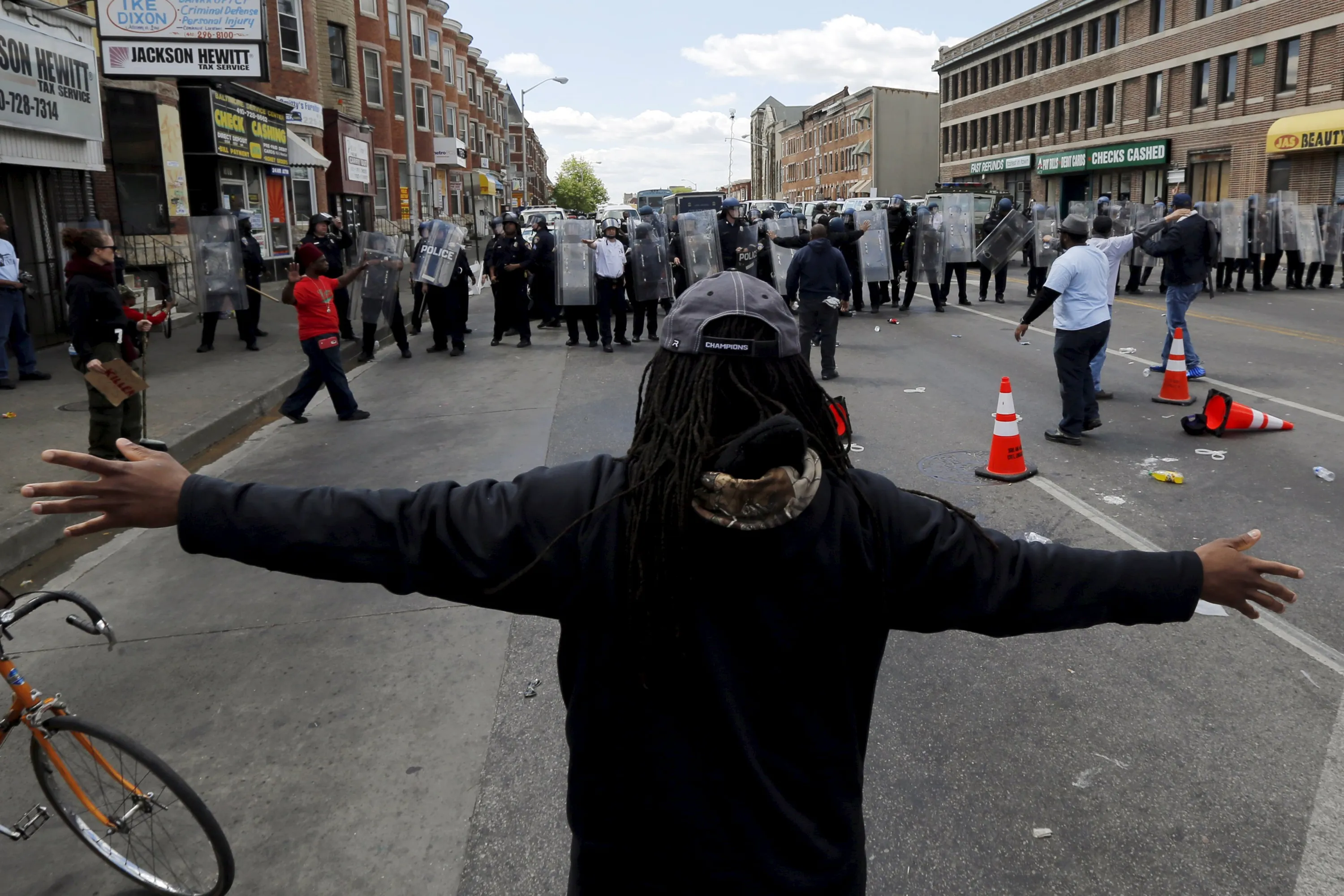 Members of the community stand between demonstrators and police officers after items were thrown and pepper spray used outside a recently looted and burned CVS store in Baltimore, Maryland, United States April 28, 2015. (Photo by Jim Bourg/Reuters)