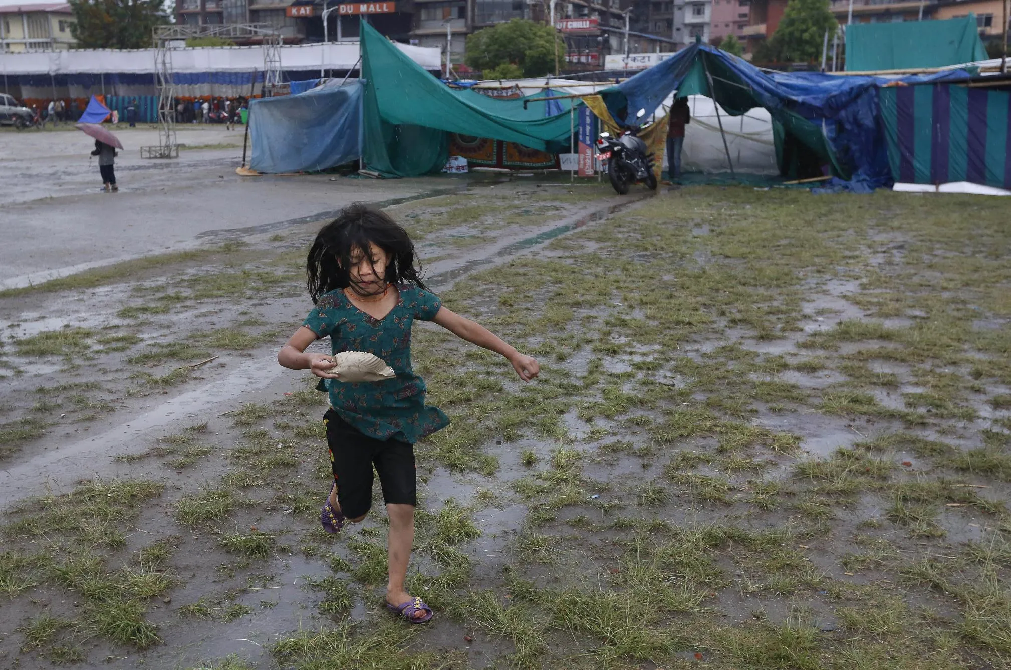 A Nepalese girl, a victim of recent earthquake, with food snacks in her hand runs back to her makeshift tent amidst a sudden rain in Kathmandu, Nepal, Tuesday, April 28, 2015. (Photo by Manish Swarup/AP Photo)
