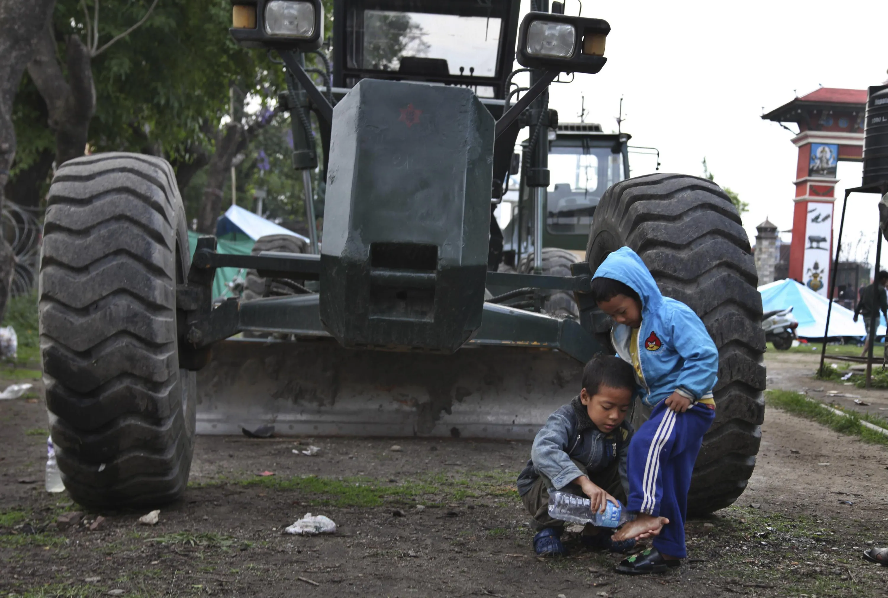 A young Nepalese boy washes the feet of his sibling next to an earth mover at a makeshift camp for the earthquake affected in Kathmandu, Nepal, Tuesday, April 28, 2015. (Photo by Altaf Qadri/AP Photo)