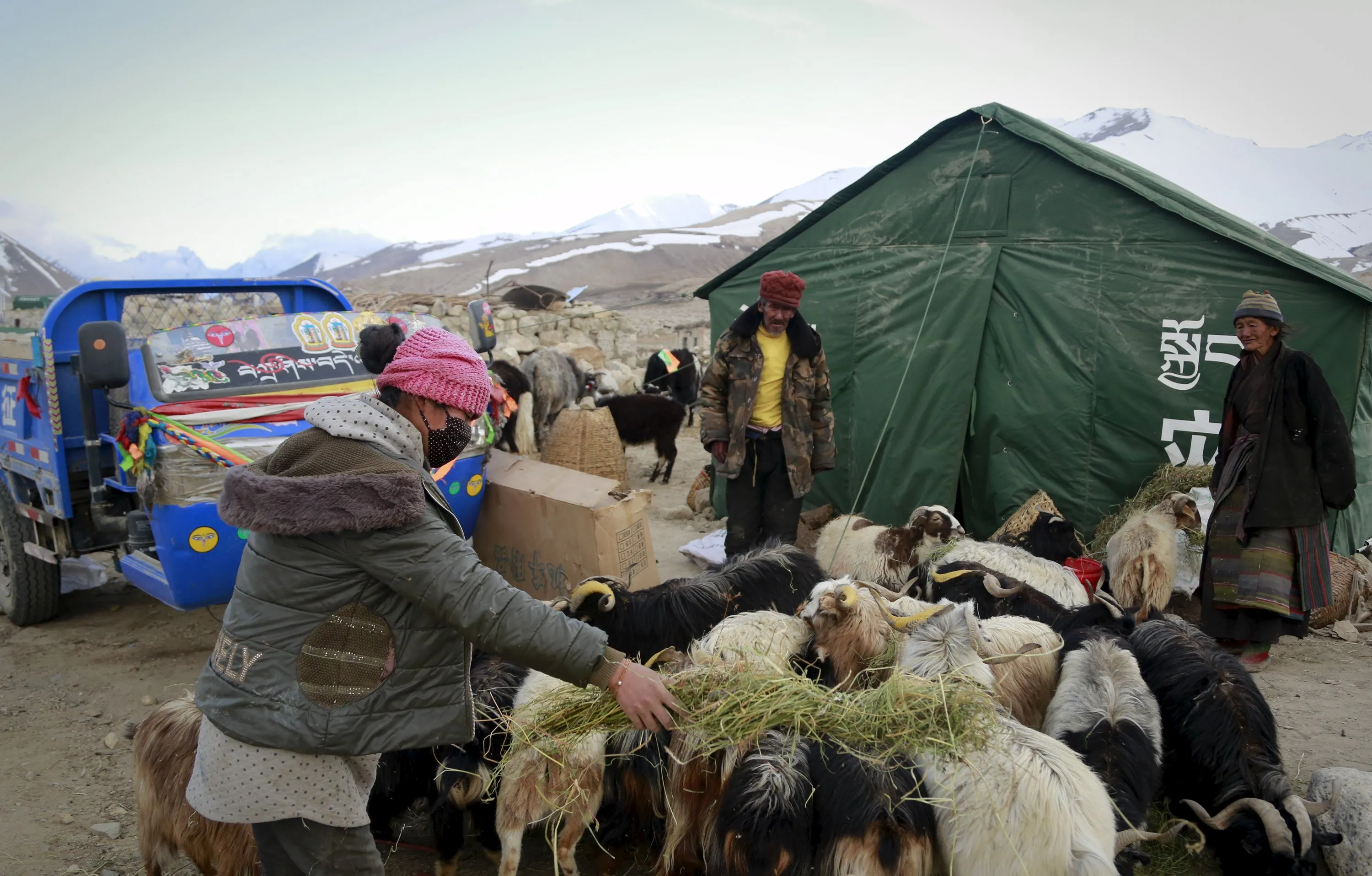 Villagers feed livestock next to a relief tent after a 7.9-magnitude earthquake hit Nepal on Saturday, in Nyalam county, Tibet Autonomous Region, China, April 27, 2015. (Photo by Reuters/China Daily)