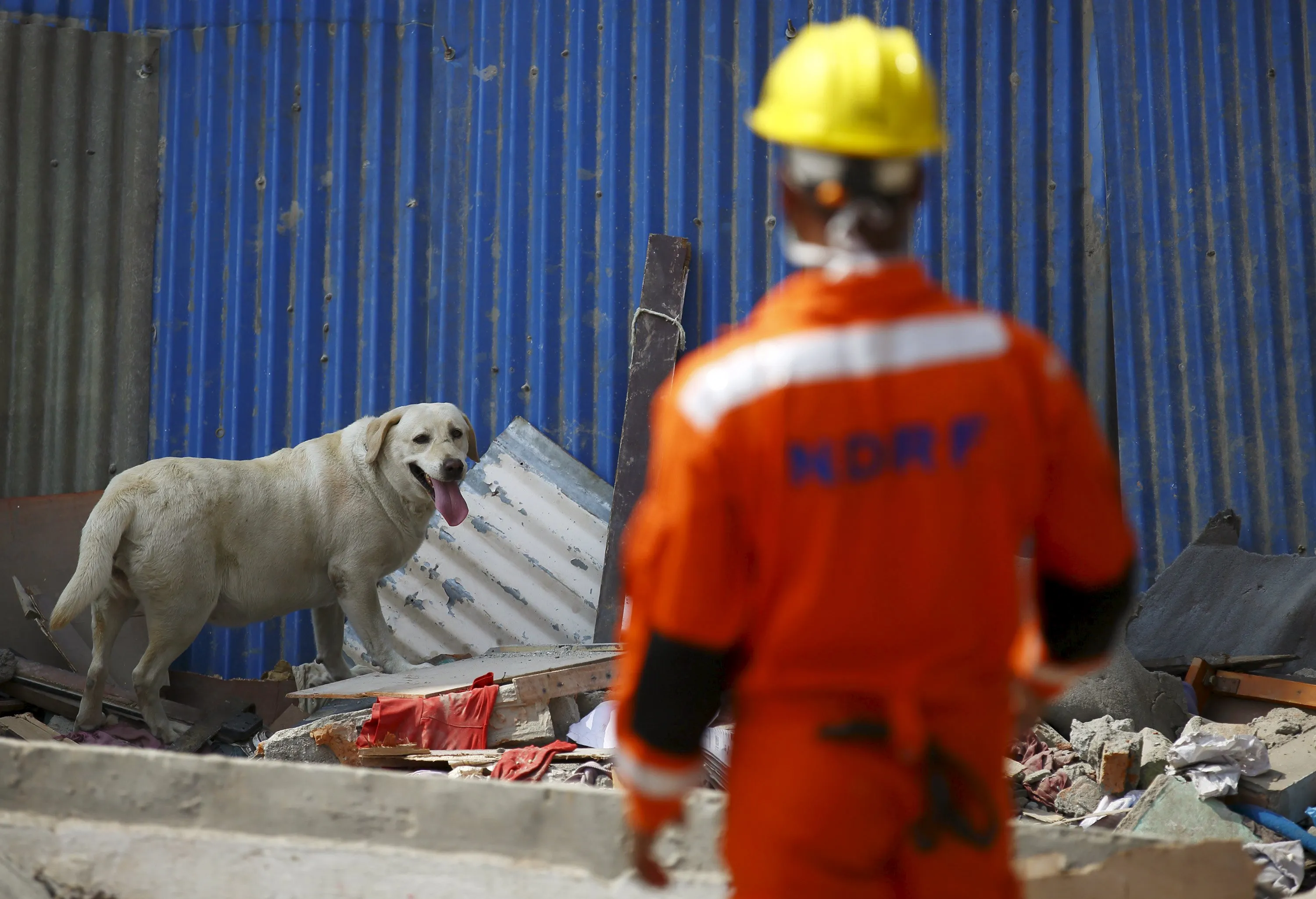 A dog searching for victims trapped under a collapsed building looks towards a member of National Disaster Response Force from Indian paramilitary force while searching for victims after Saturday's earthquake in Kathmandu, Nepal April 28, 2015. (Photo by Navesh Chitrakar/Reuters)