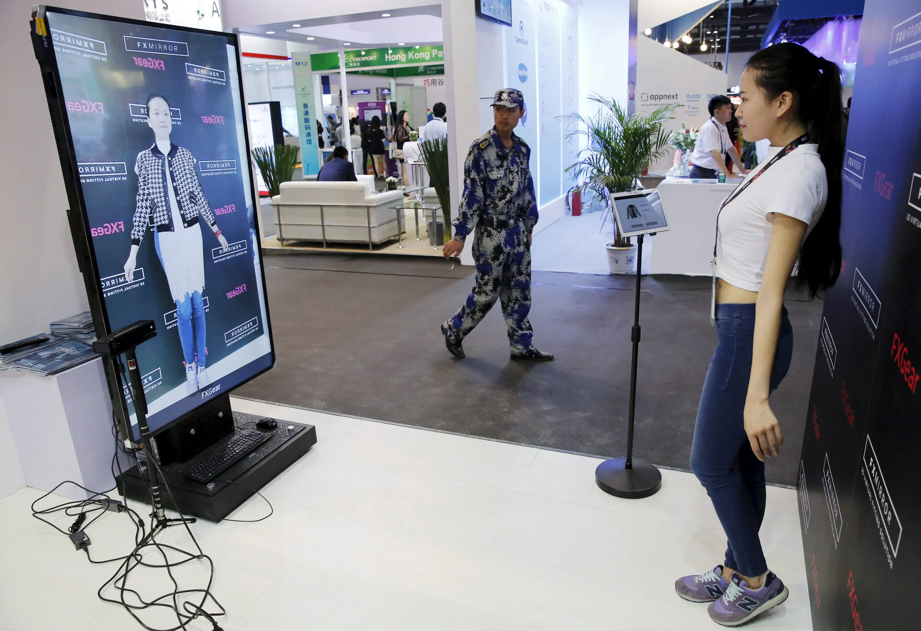 A staff demonstrates FXMirror, a virtual reality fitting room solution developed by FXGear, at the Global Mobile Internet Conference (GMIC) 2015 in Beijing, China, April 28, 2015. (Photo by Kim Kyung-Hoon/Reuters)