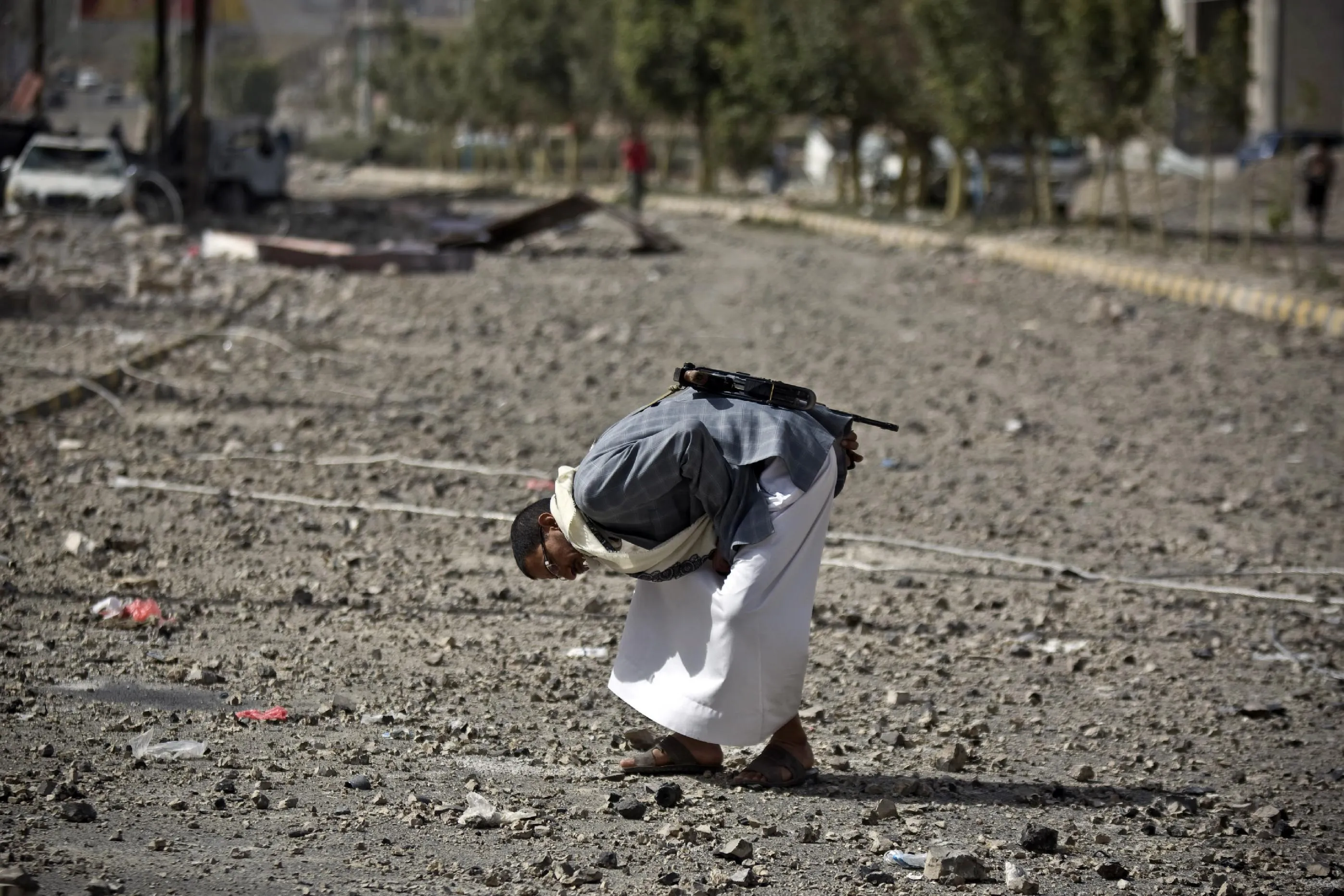 In this Monday, April 20, 2015 file photo, a Shiite fighter known as Houthi checks an item on a street littered by debris after a Saudi-led airstrike hit a site where many believe the largest weapons cache in Yemen's capital, Sanaa, is located. (Photo by Hani Mohammed/AP Photo)
